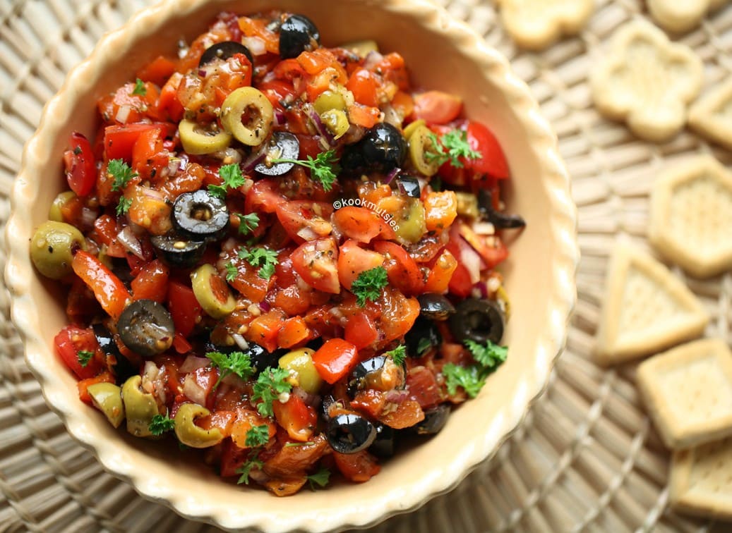 Snijd de gegrilde paprika's, rode ui, augurk en olijven klein.