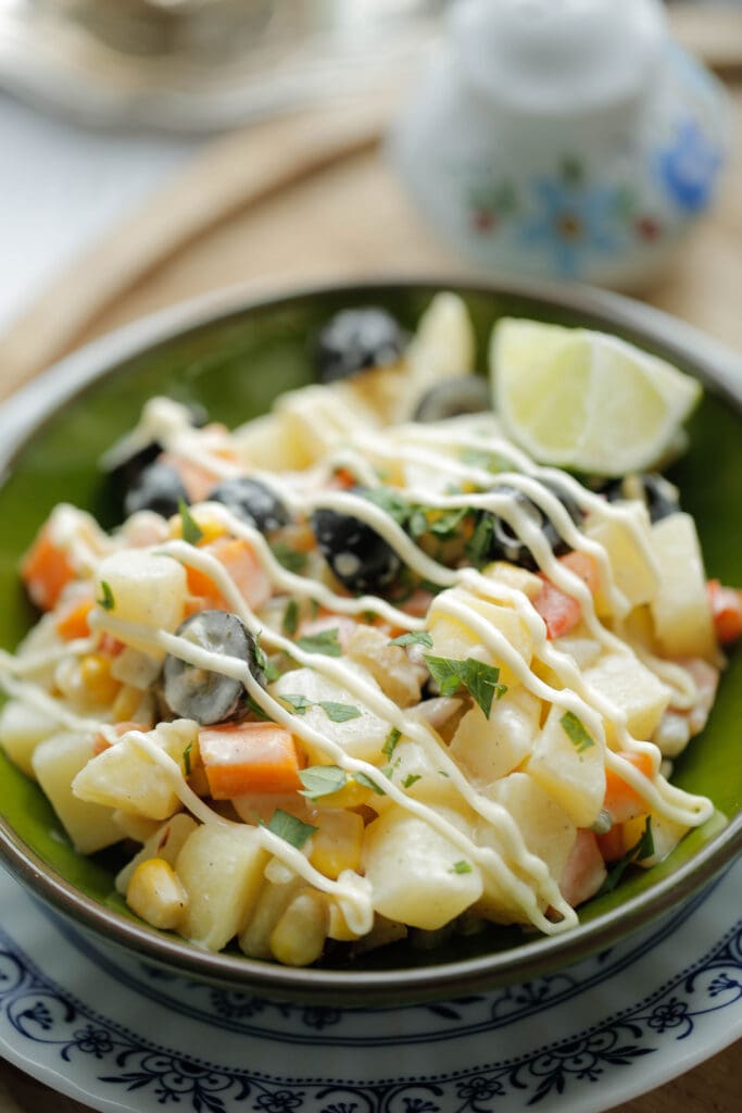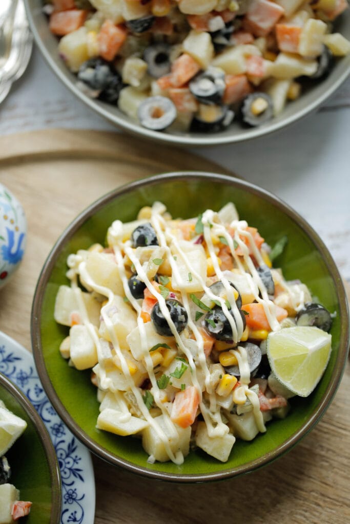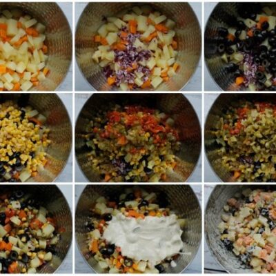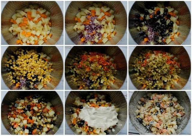 Doe de aardappels en wortels in een diepe kom. Voeg de rode ui, olijven, gegrilde paprika, mais en augurk toe. Meng goed. Voeg de dressing toe en meng goed. Voeg zout toe naar smaak.