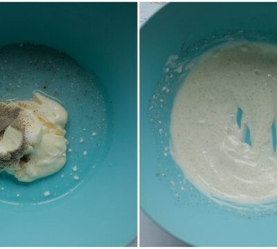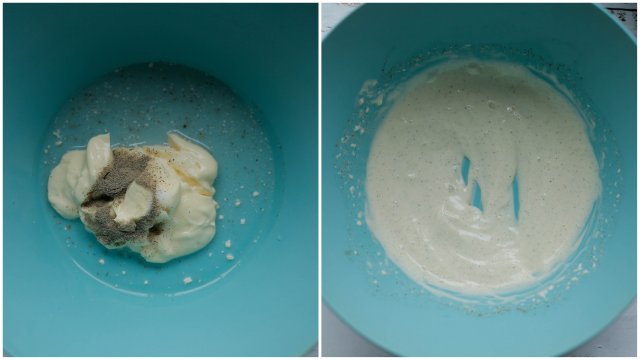 Doe de mayonaise, azijn, zwarte peper en zout naar smaak in een diepe kom. Meng goed.