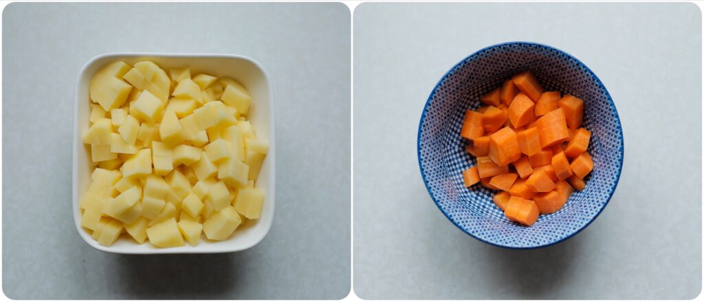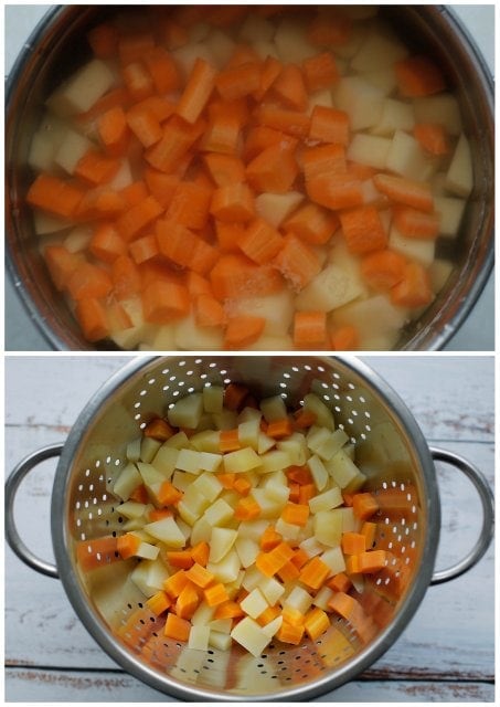 Breng de aardappels en wortels in een pan met water en zout aan de kook. Kook deze gaar in ca. 10-12 minuten of tot de aardappels en wortels zacht zijn. Laat het water uitlekken.