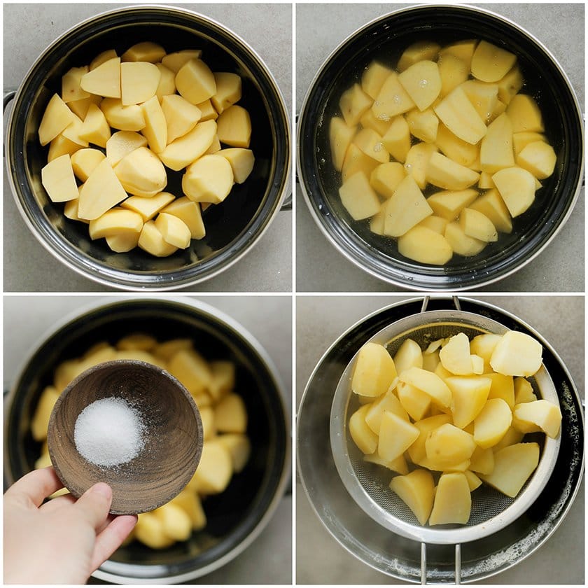 Was, schil en snijd de aardappels in blokjes. Breng een pan met halfvol water aan de kook. Voeg het zout toe en vervolgens de aardappels. Kook ze 15-20 minuten of tot ze zacht zijn. Giet het water af.