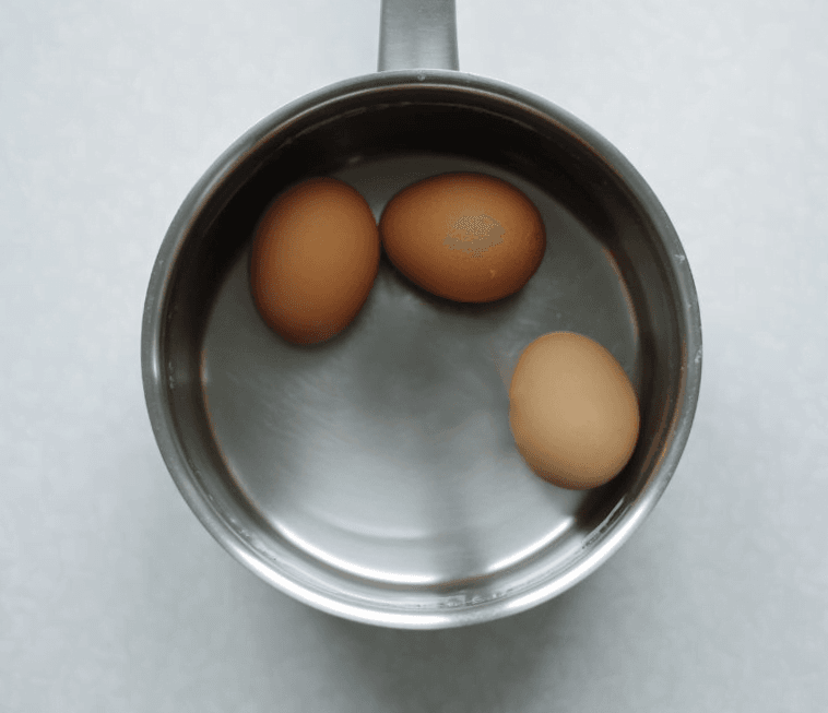 Vul een steelpan met water en breng het aan de kook. Voeg de eieren toe en kook ze in 12-15 minuten gaar. Giet het water af.