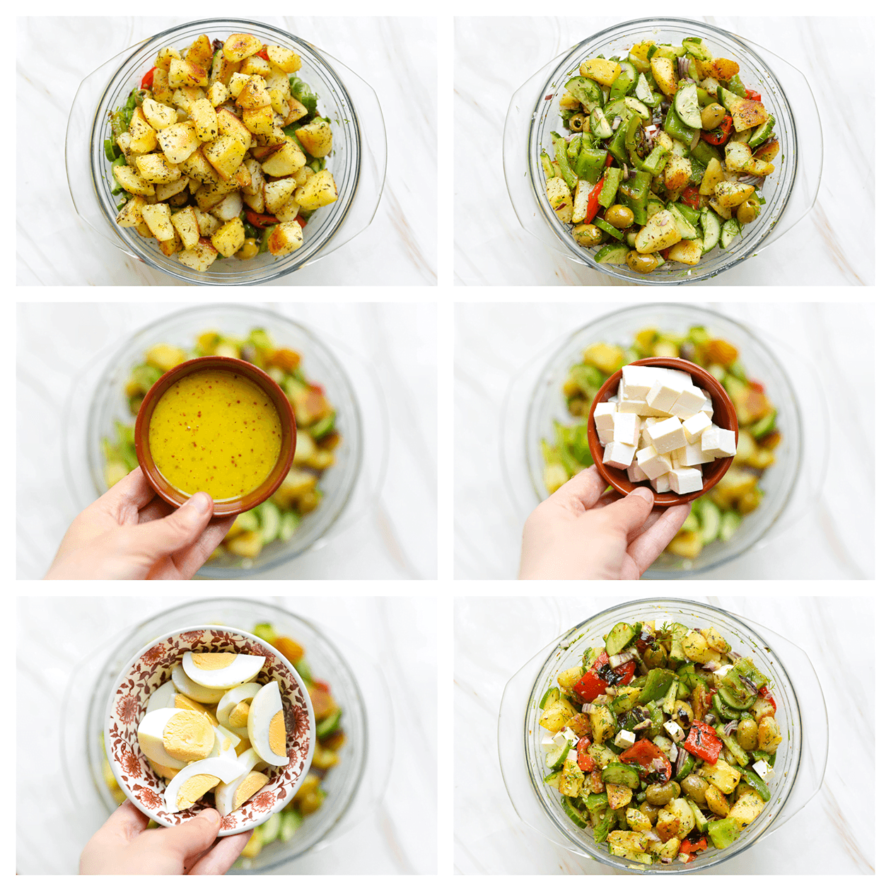 Pel de eieren en snijd ze in stukken. Voeg de gebakken aardappels toe en meng goed. Voeg de honing-mosterdsaus en feta kaas toe. Meng alles goed door elkaar. Verdeel de aardappelsalade over een bord en voeg gekookte eieren toe.