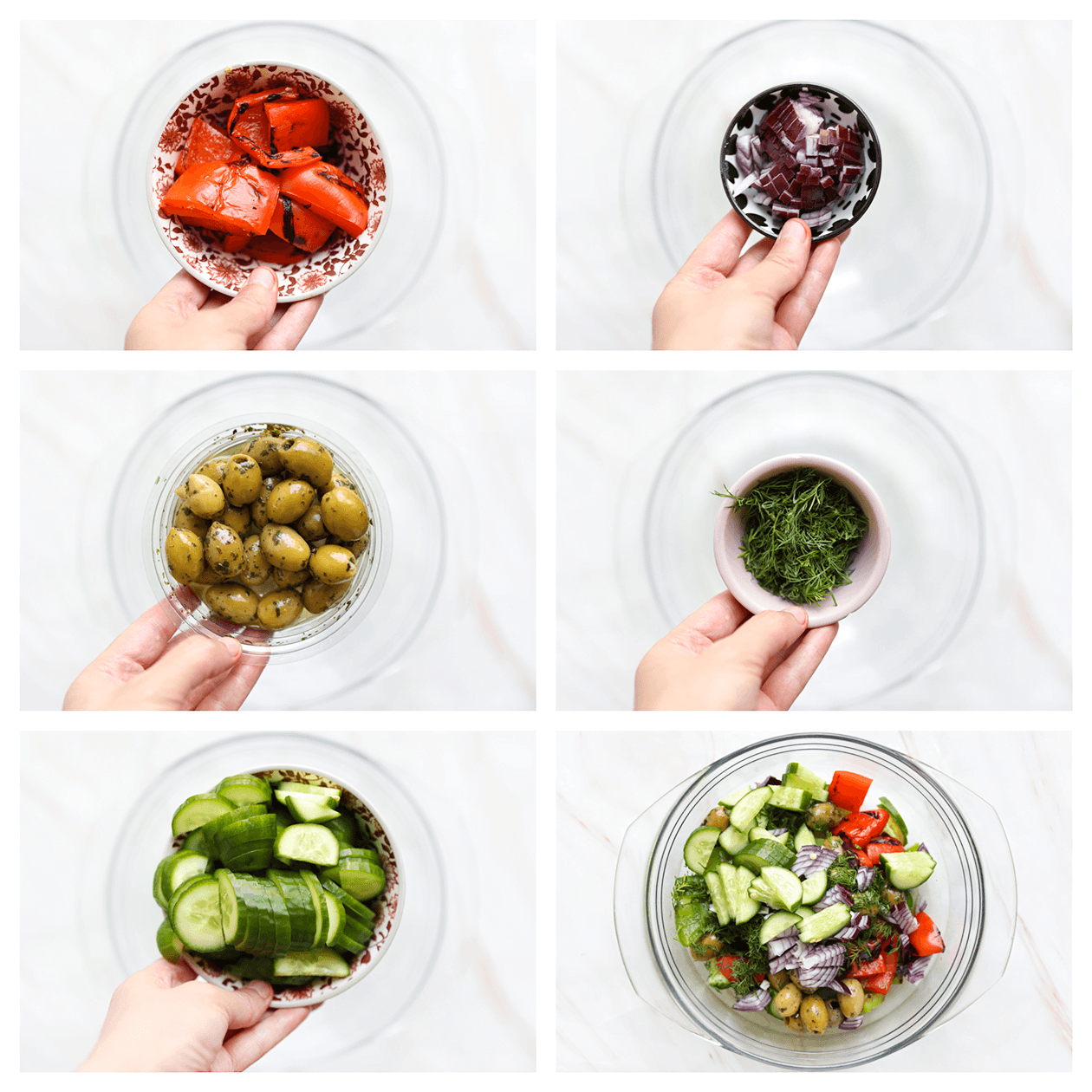 Snijd de gegrilde rode paprika en gegrilde groene paprika in stukken. Pel en snipper de rode ui. Hak de dille fijn. Snijd de komkommer in plakjes en halveer ze. Doe deze groenten samen met de groene olijven in een diepe kom en meng goed.