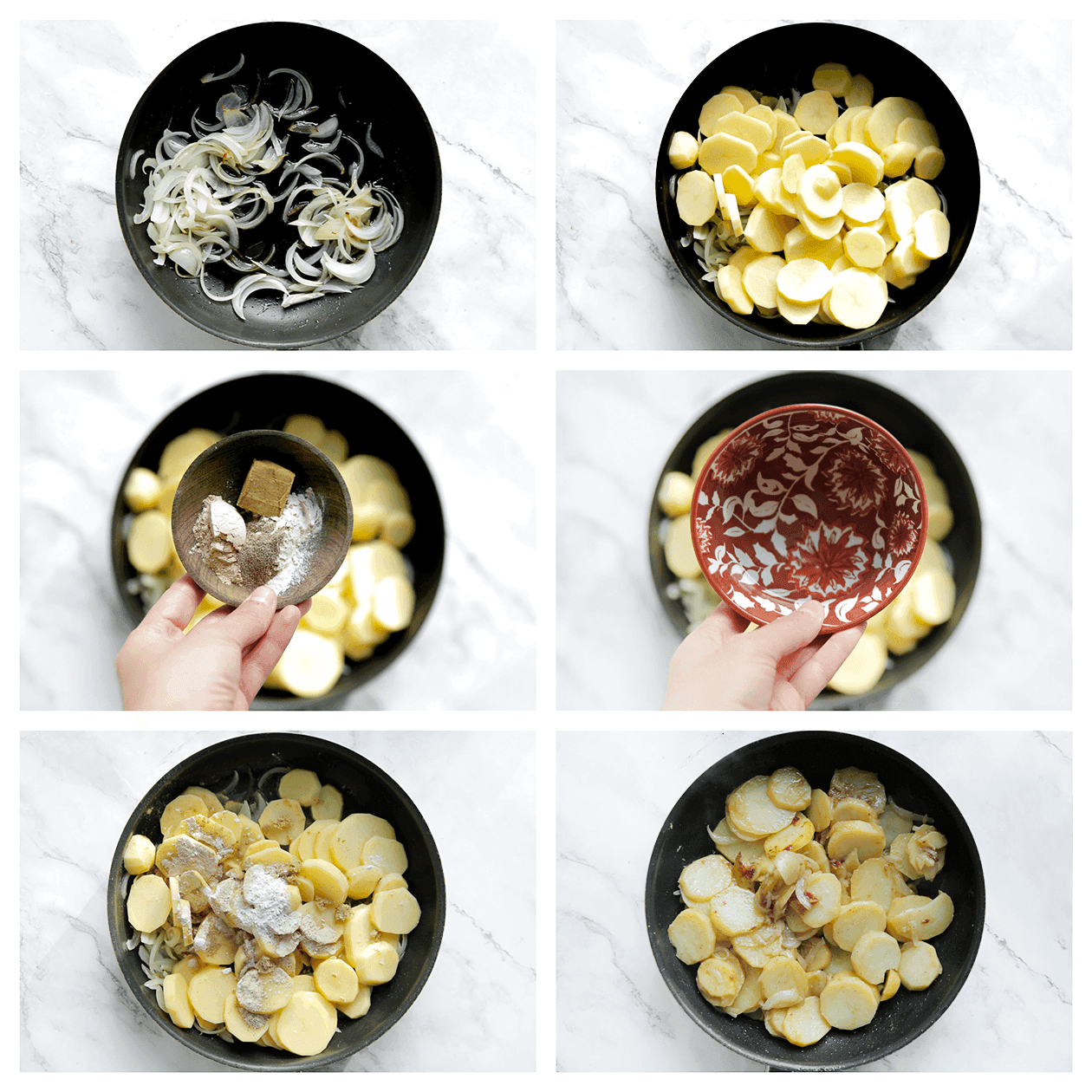 Schil en snijd de aardappels in plakjes. Pel en snijd de gele ui in halve ringen. |