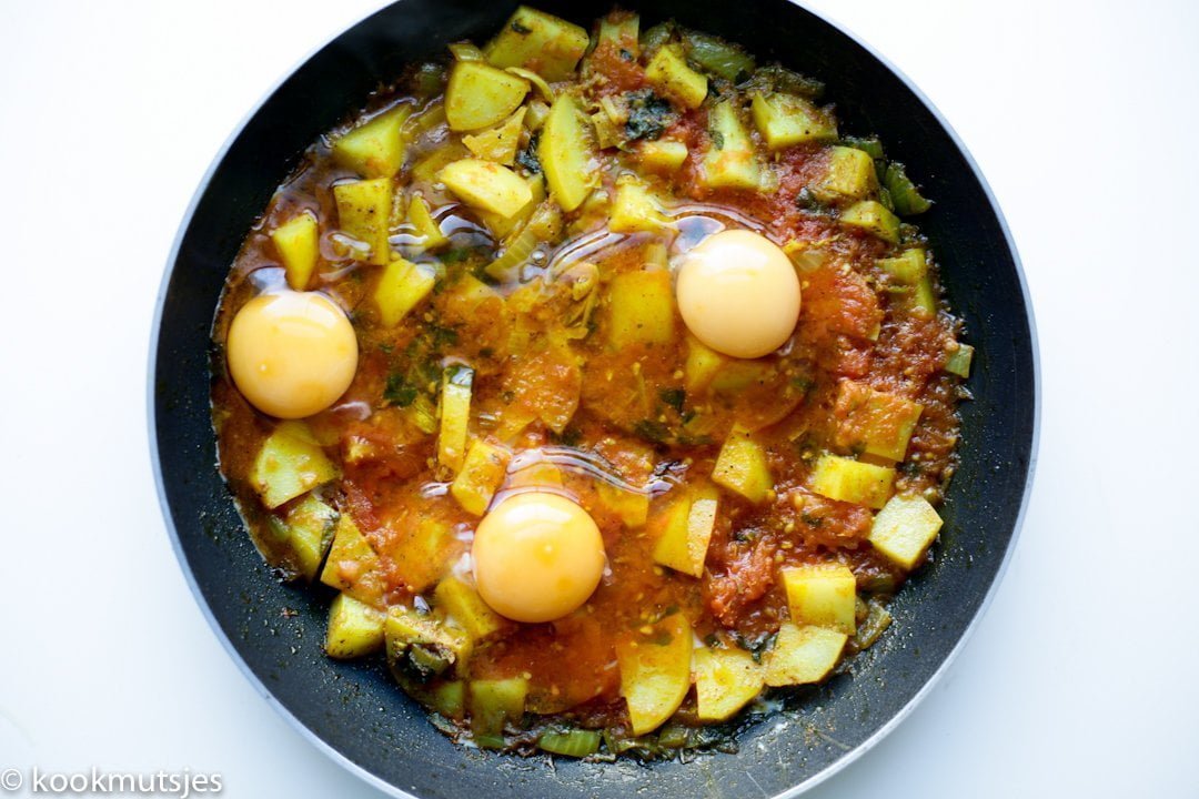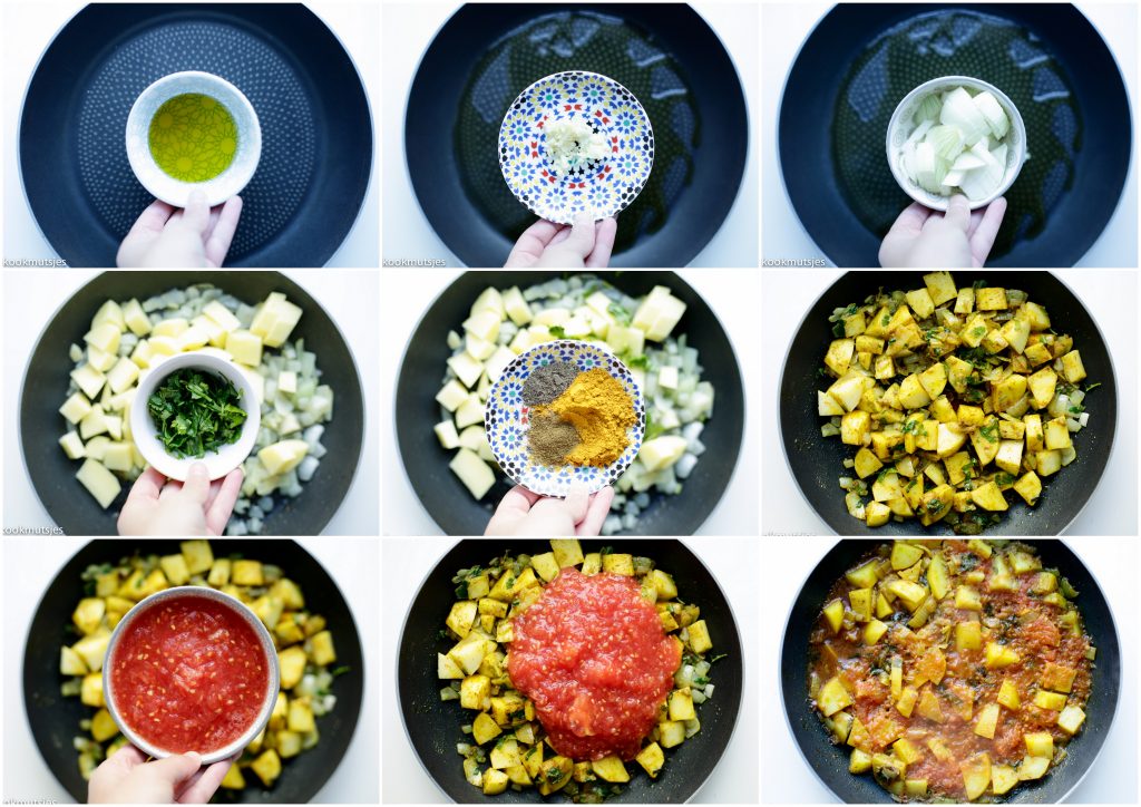 Verhit de olijfolie in een pan. Voeg de ui en knoflook toe en bak het voor zo’n 3 minuten samen. Voeg de aardappels, koriander, ras el hanout, zwarte peper, komijn en zout toe, bak zo’n 2 minuten samen. Voeg de tomaat toe, leg de deksel er op en zet het vuur hoog. Wanneer het borrelt zet je het vuur op z’n laagst en laat je het verder pruttelen voor zo’n 12 tot 15 minuten. |