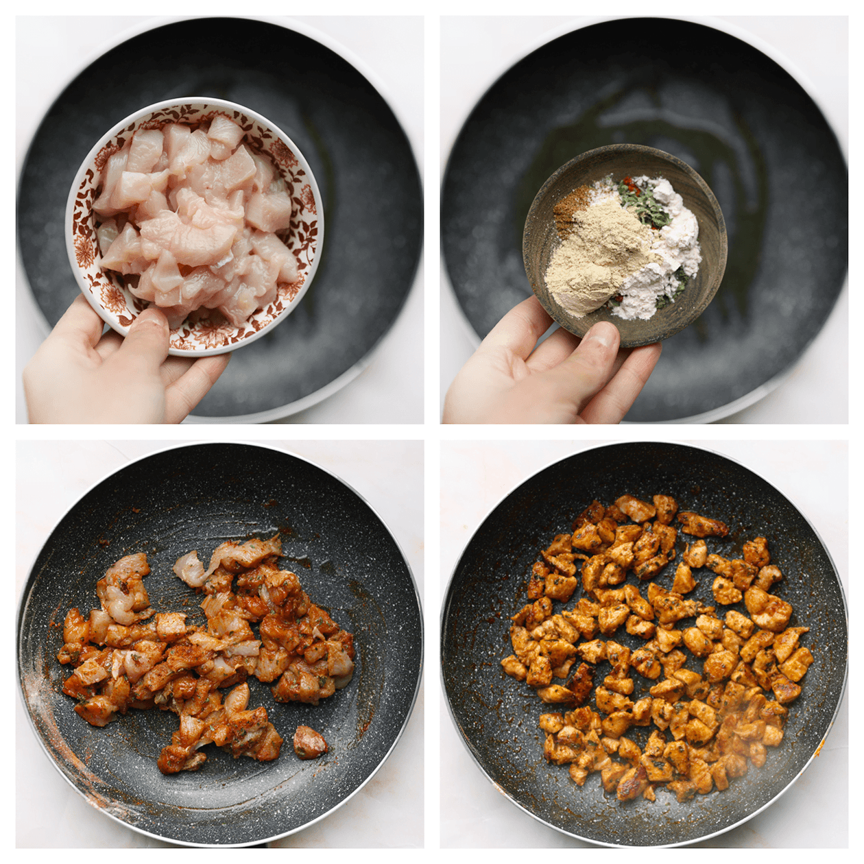 Verhit de olijfolie in een koekenpan op middelhoog vuur. Voeg de kip, het zout, knoflookpoeder, uienpoeder, de ras el hanout, komijnpoeder, gedroogde peterselie en cayennepeper toe. Meng goed en bak in ca. 6-7 minuten gaar. Leg apart.