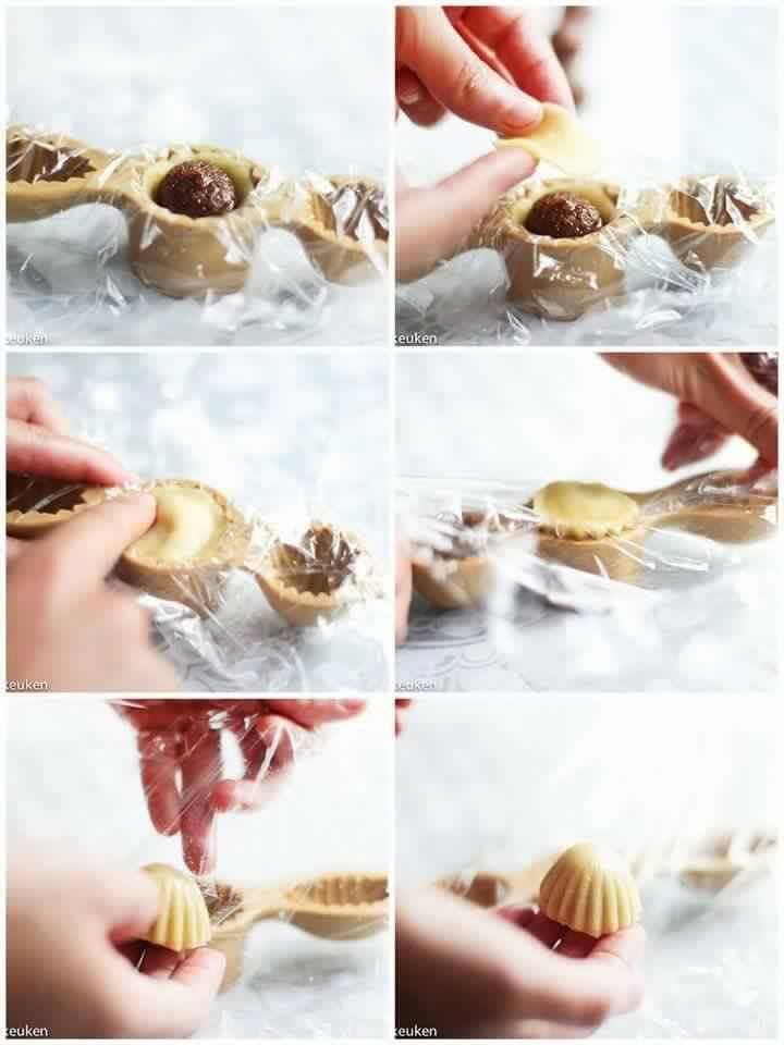 Bedek de koekjes vorm met huishoudfolie. Druk het deeg in de koekjes vorm en leg er een amandelballetje in. Bedek het met een plakje deeg en druk het plat. Door de huishoudfolie kun je ze er makkelijk uit halen. Leg wat bakpapier op de bakplaat en leg de koekjesdeeg erop. |