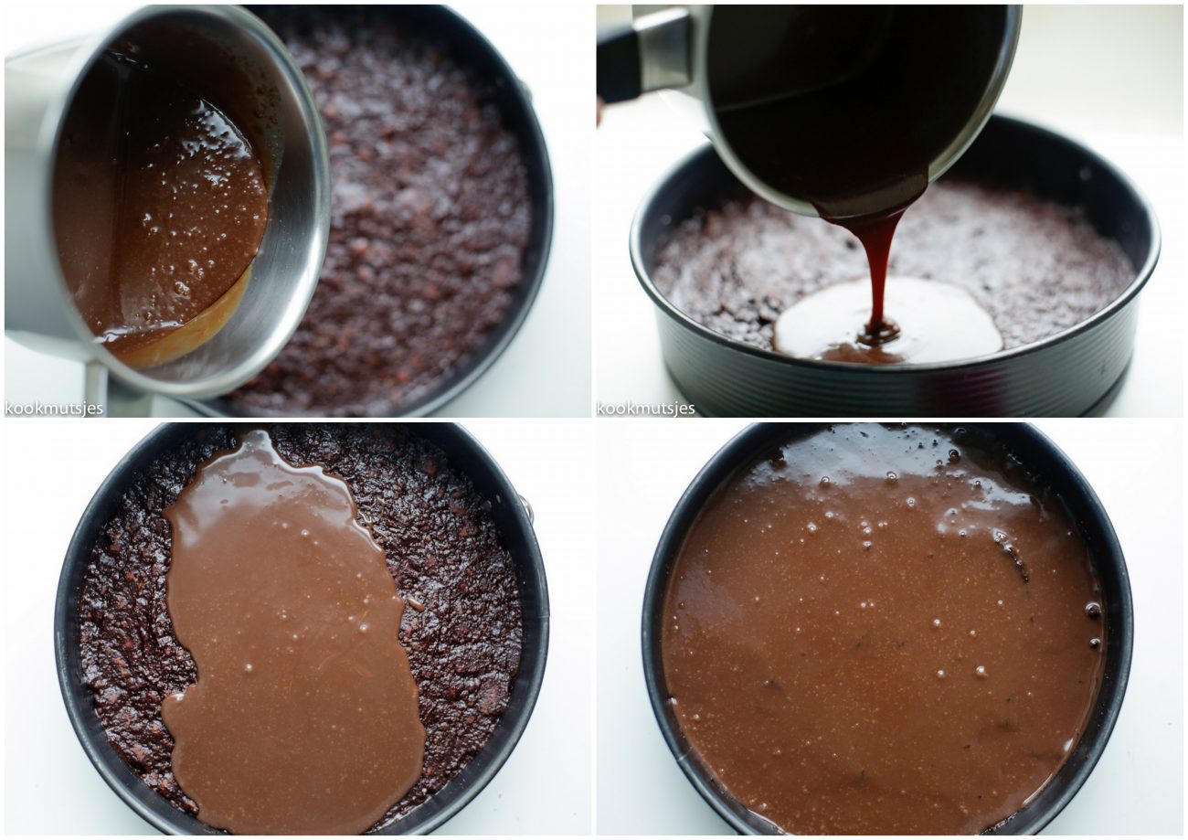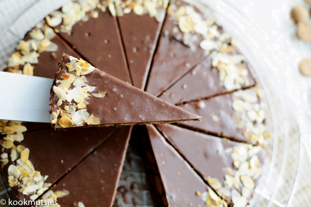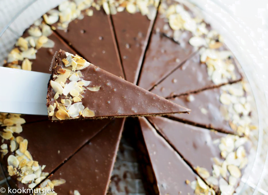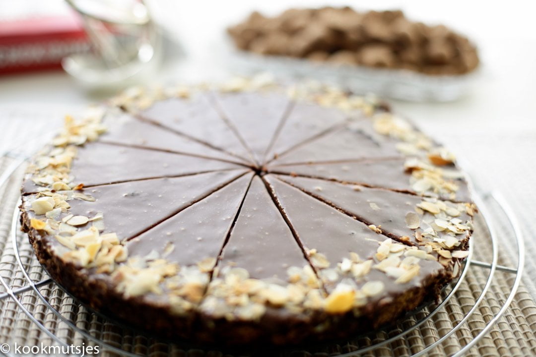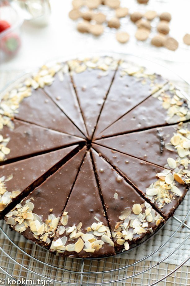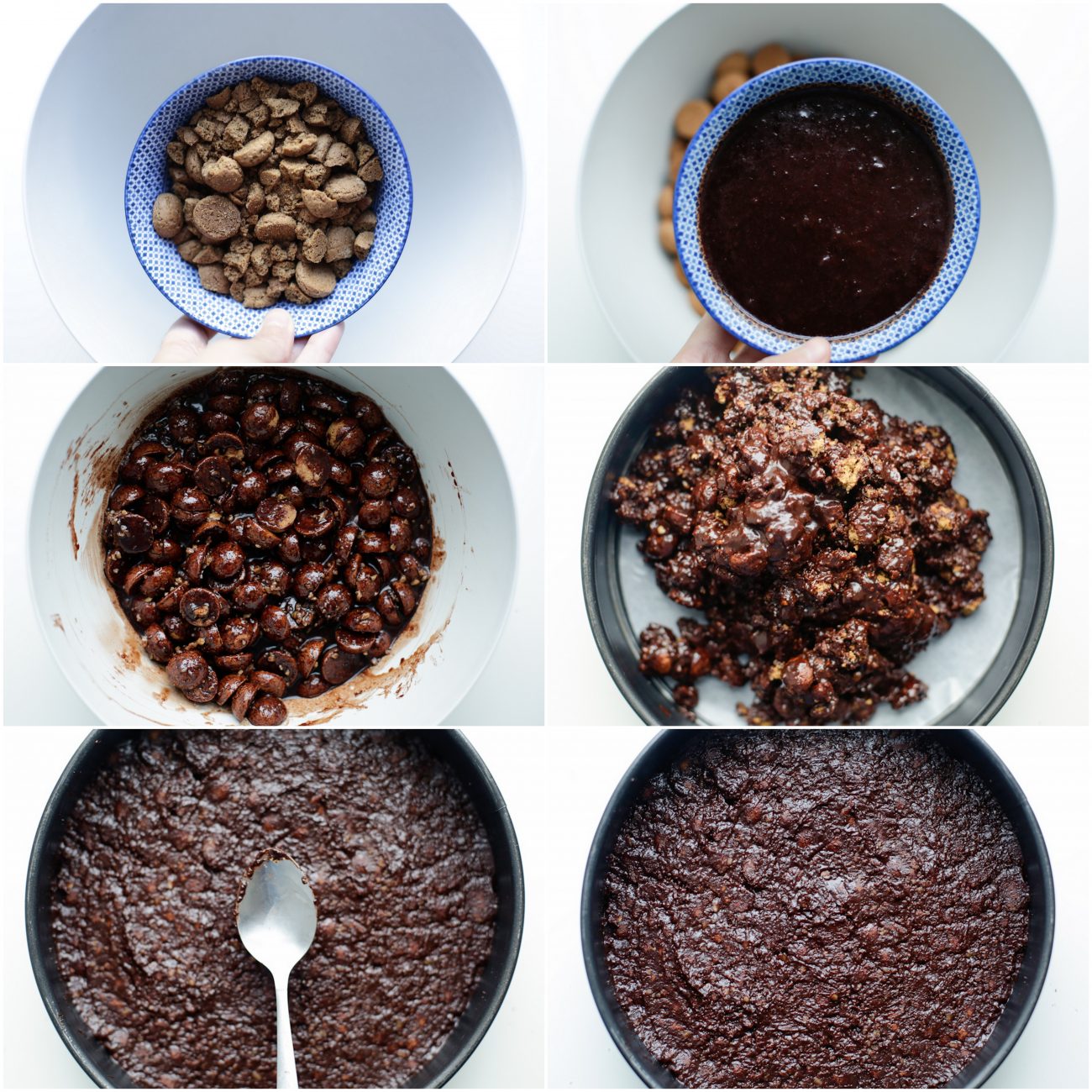 Hak de pepernoten en amandelen in stukken en doe ze in een diepe kom. Voeg de chocoladesiroop toe en meng het samen tot een geheel. Neem een springvorm en leg er bakpapier in. Verdeel de pepernoten mengsel gelijkmatig over de springvorm en druk het met een lepel plat. Dek het af en leg het weg in de koelkast. |