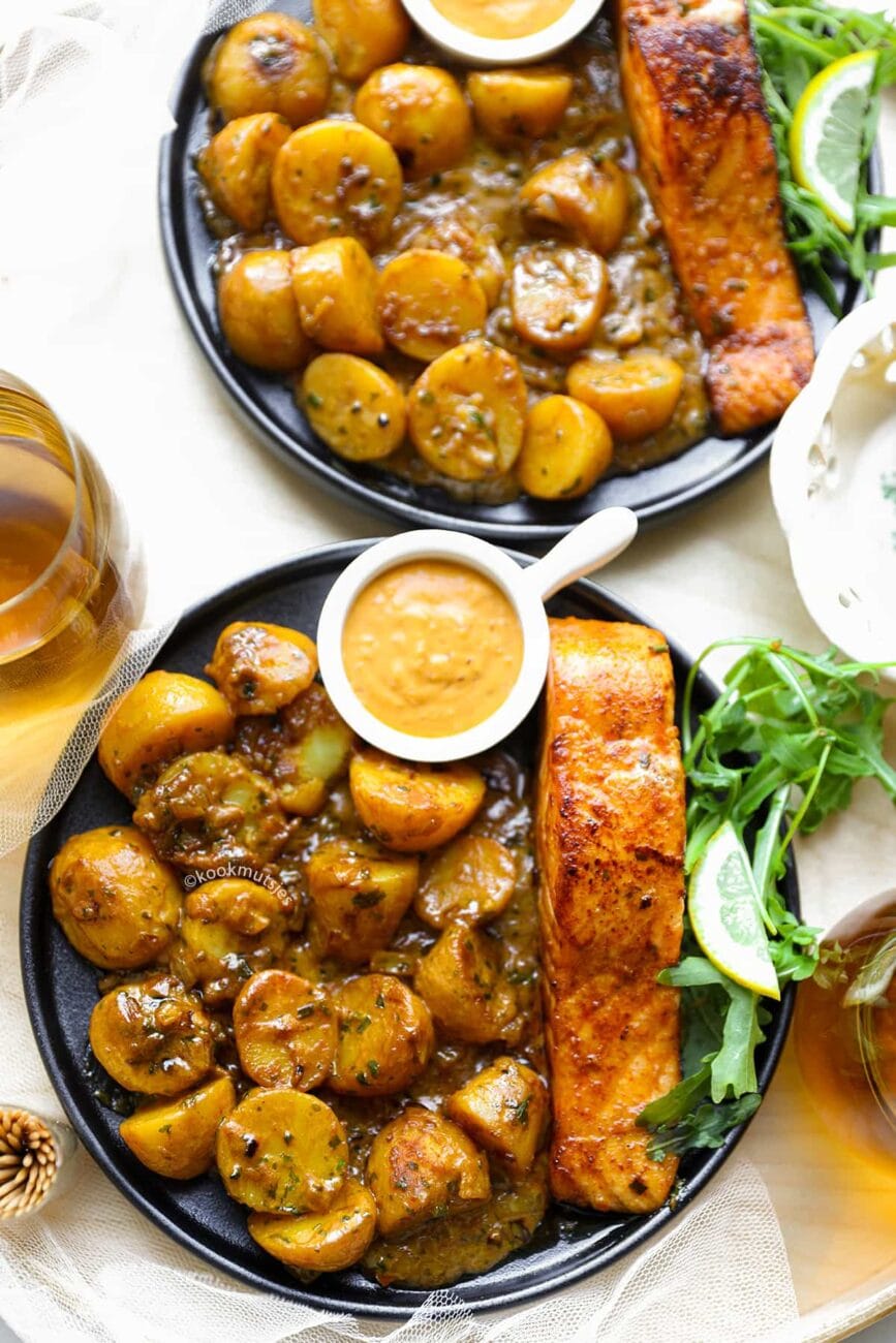 Dive into this easy-peasy dish with juicy salmon fillets and tasty seasoned baby potatoes, smothered in a mouthwatering sauce. It’s a flavor explosion you’ll keep craving!