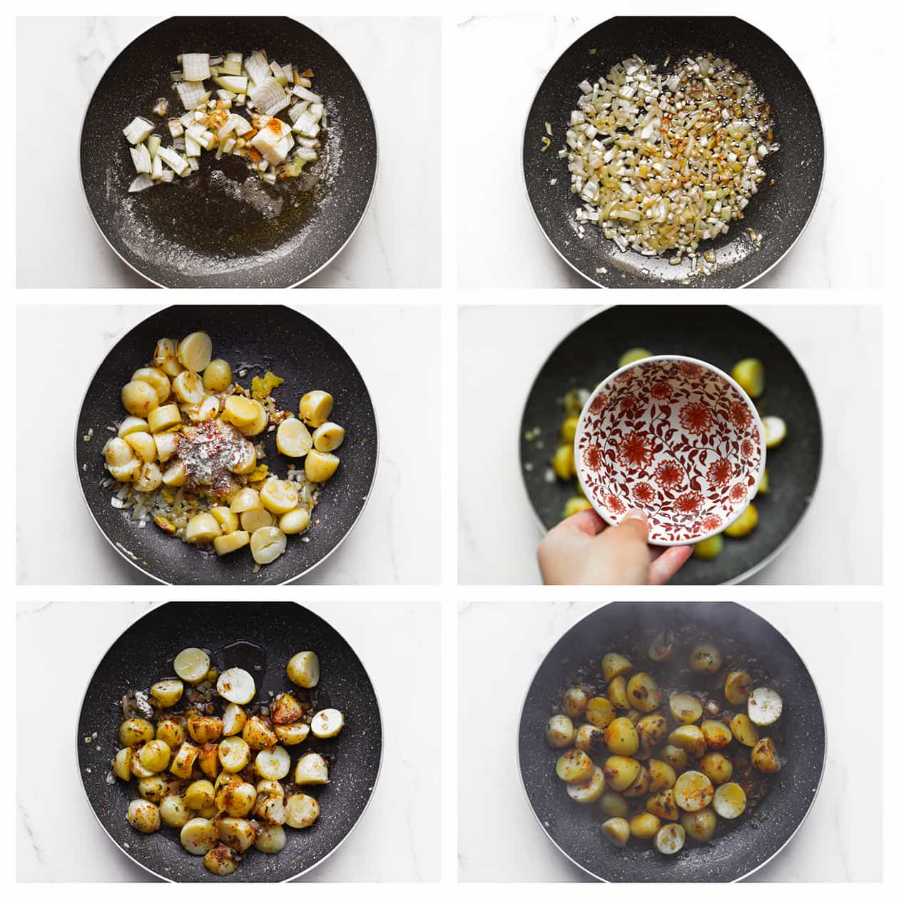 Heat olive oil and butter in a skillet over medium-high heat. Add the diced yellow onion and sauté for 3-4 minutes until golden brown. Then add the potatoes, onion powder, garlic powder, and cayenne pepper. Crumble the chicken stock cube over the skillet and sauté briefly until combined. Then add the water and mix well. |