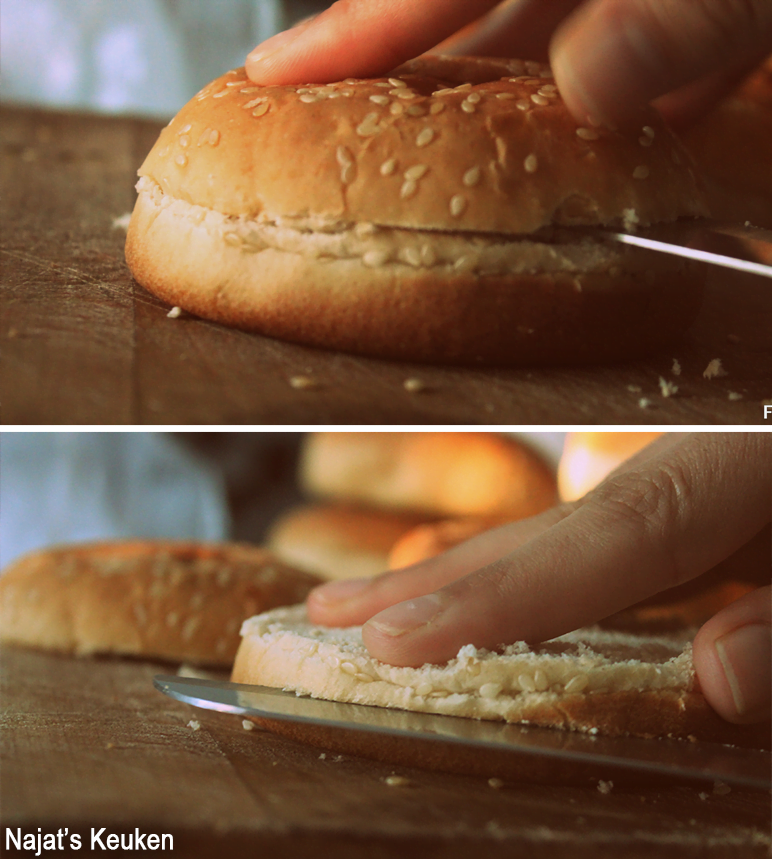 Druk de gehaktballen plat in de vorm van een burger (een halve centimeter dik). Leg er bakpapier op, druk er zachtjes op tot de bakpapier goed aan het vlees plakt. Leg de burgers in de vriezer voor minimaal een half uur. |