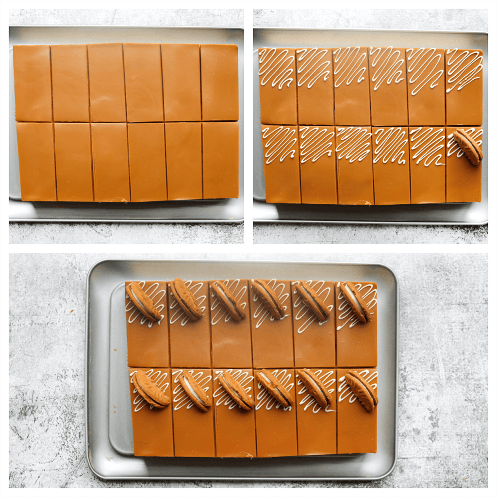 Decorate with white ganache, biscoff cookies, or even fresh fruit or nuts for a creative touch.