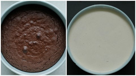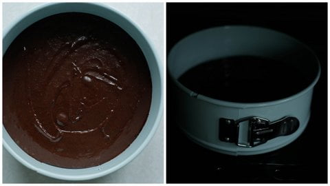 Voeg het cheesecake beslag over de brownie laag. Leg de cheesecake in de voorverwarmde oven op 115℃ voor zo’n 60 tot 65 minuten of tot de zijkanten van de cheesecake goed stevig zijn en het middengedeelte nog een beetje wiebelt. Zet daarna de oven uit en laat de brownie-cheesecake er nog in zitten voor een uur. Dit voorkomt dat de cheesecake inzakt of scheurt. |