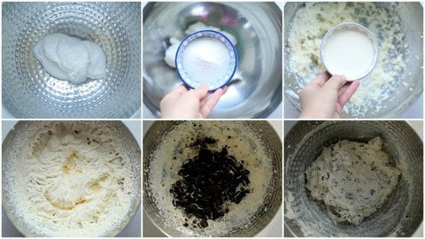 Voeg de roomkaas samen met de crème fraîche in een diepe kom, klop dit op voor een minuut. Voeg de suiker, vanillesuiker en zout toe en mix het samen voor een minuut. Voeg de maïzena toe en mix weer tot een geheel. Leg de mixer weg en gebruik vanaf nu de spatel. Los de eieren één voor één luchtig op met de spatel (doet dit niet met een mixer, want dan klop je het beslag op). |