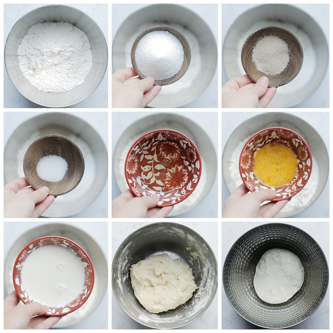 Doe de bloem samen met de suiker, gist, het zout, de zonnebloemolie, het geklutste ei, de melk en het water in een diepe kom. Meng goed en kneed het deeg 10-12 minuten tot een mooi deegje.