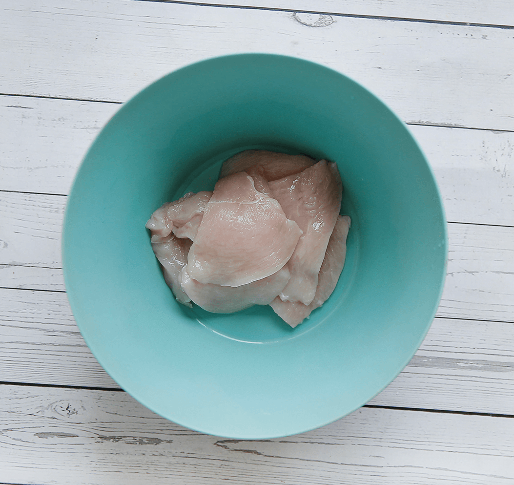 Was en snijd de kipfilet in de lengte in plakjes. Ik heb hier 8 plakken uit gehaald.