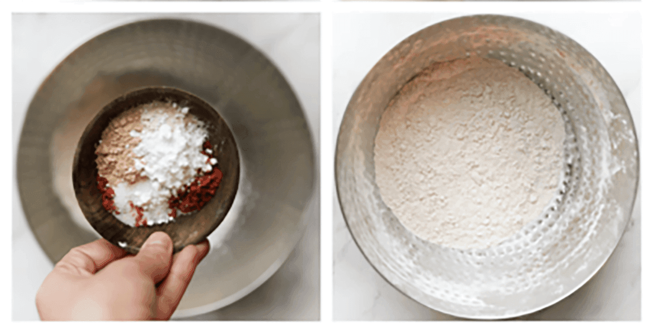 Neem een andere kom. Doe hier de bloem, het zout, uienpoeder, zwarte peper en cayennepeper in. Meng goed.
