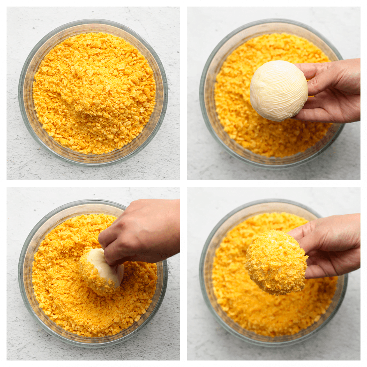 Haal het bolletje deeg door de Bugles-kruimels.