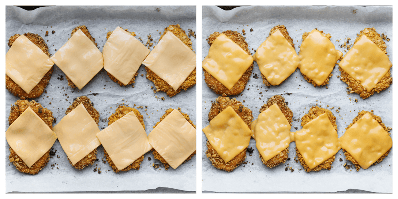 Haal de kipburgers voorzichtig uit de oven en leg er cheddar kaas op.
