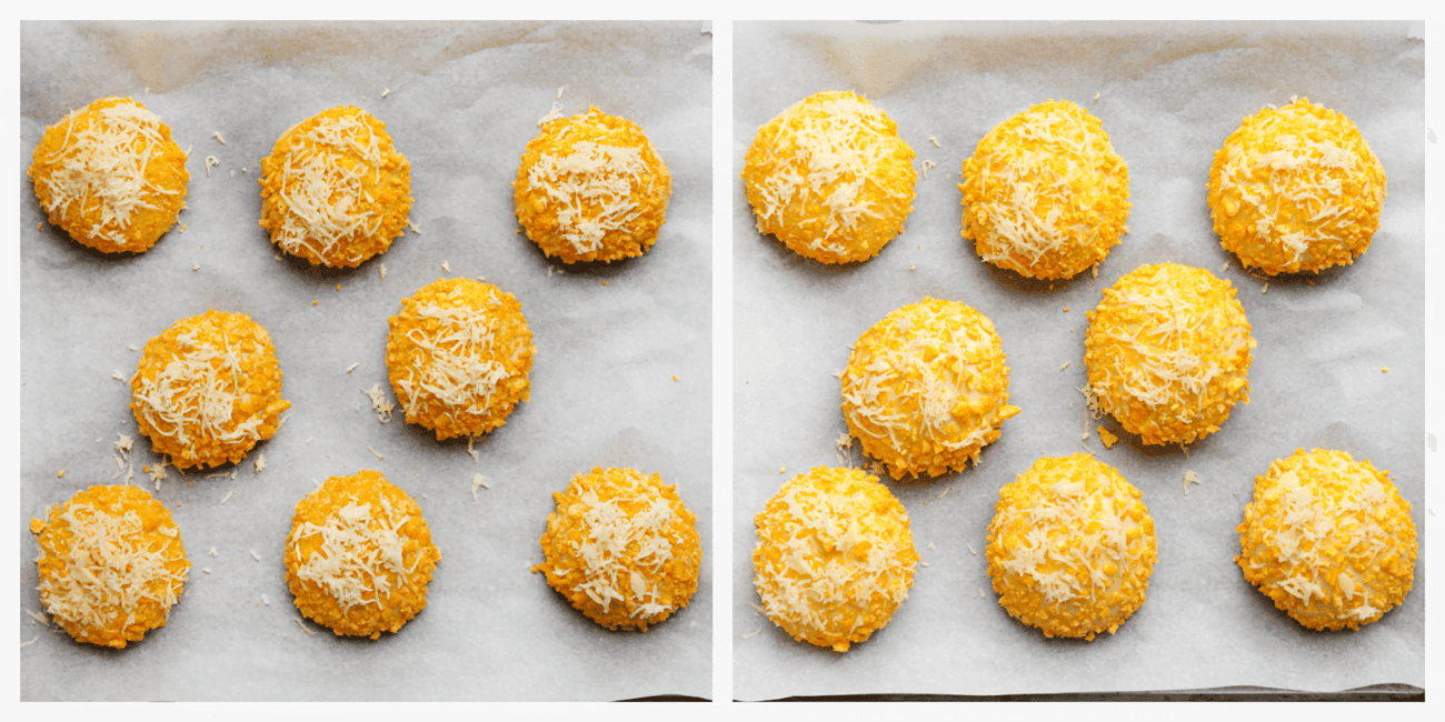 Zet het deeg op een bakplaat met bakpapier. Herhaal deze werkwijze. Strooi er wat geraspte kaas over. Laat de broodjes 30 minuten rijzen, of tot ze in omvang zijn verdubbeld.