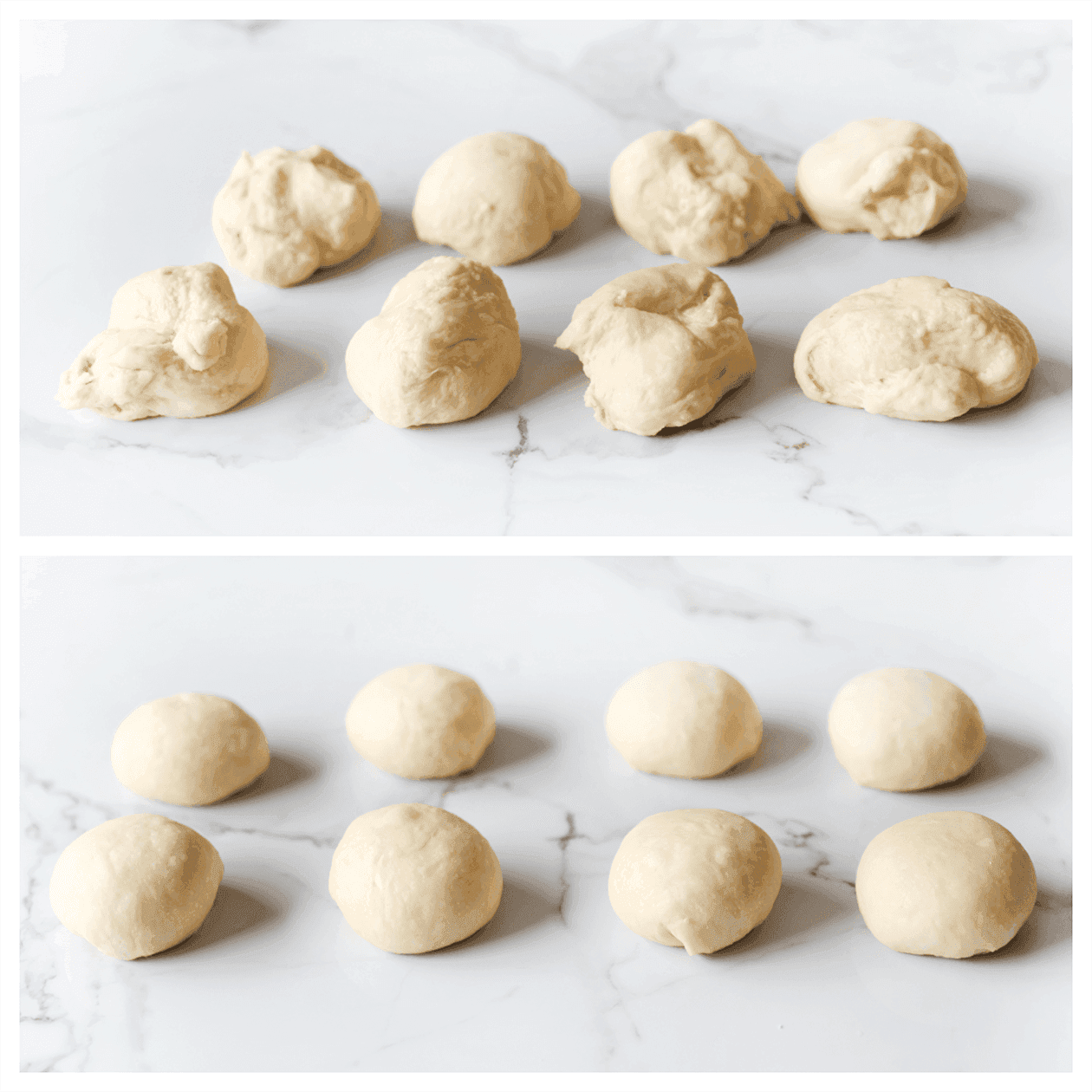 Verdeel het deeg in 8 gelijke stukken en vorm ze mooi rond.