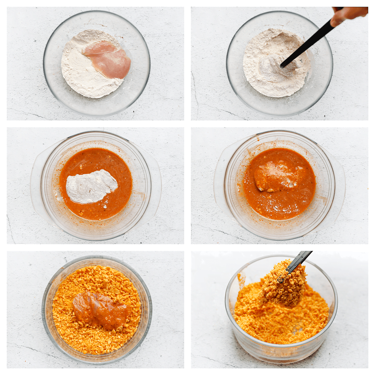 Haal de kip achtereenvolgens door het bloemmengsel, het karnemelkmengsel en de verkruimelde Bugles.