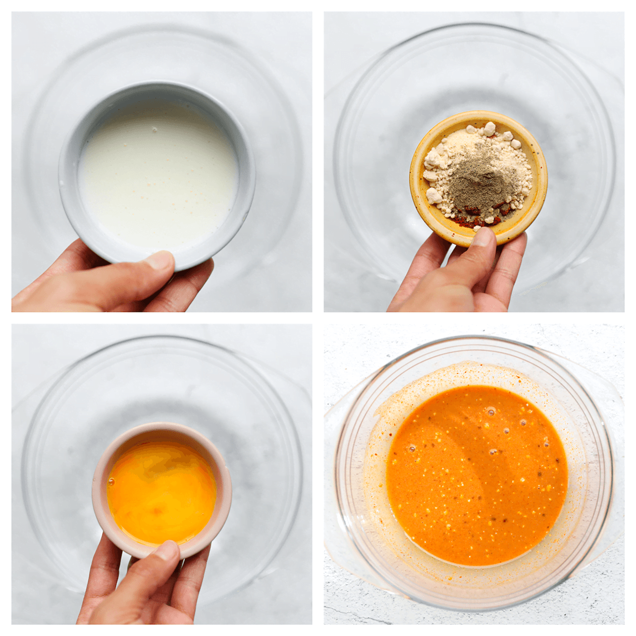 Doe de karnemelk, het zout, uienpoeder, knoflookpoeder, cayennepeper, paprikapoeder, zwarte peper en het geklutste ei in een diepe kom. Meng goed.