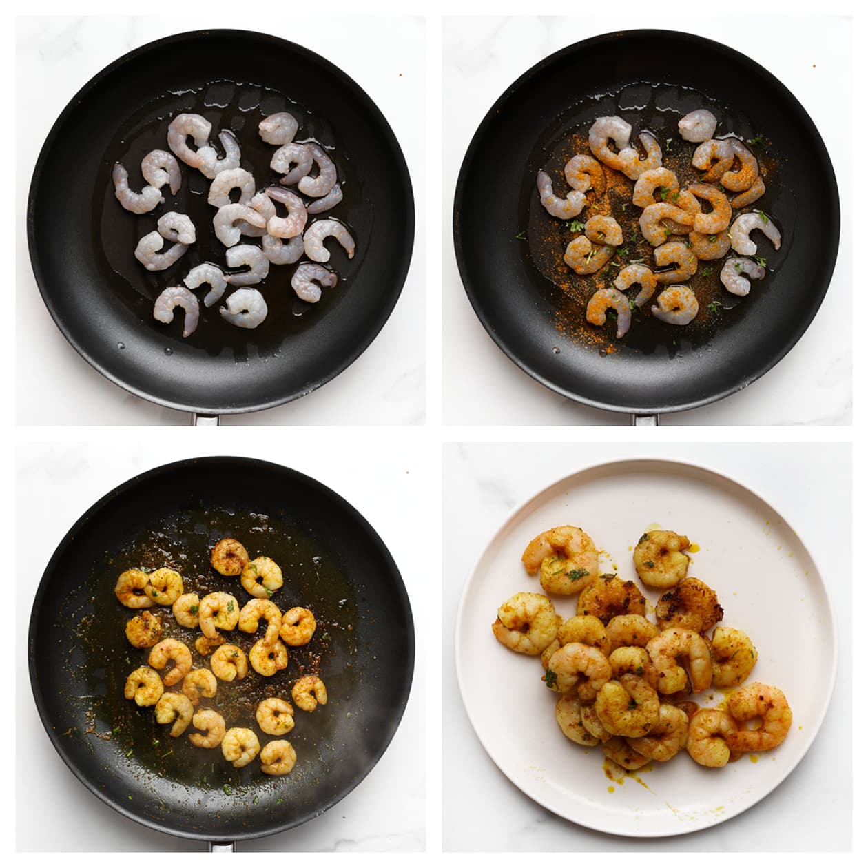 Verhit 25 ml olijfolie in een koekenpan met dikke bodem op middelhoog vuur. Voeg de garnalen, ras el hanout, knoflookpoeder, cayennepeper en fijngehakte peterselie toe. Bak de garnalen 1-2 minuten per kant, of tot ze gaar zijn. Garnalen zijn klaar wanneer ze roze en ondoorzichtig zijn. Haal de garnalen uit de pan en zet apart.