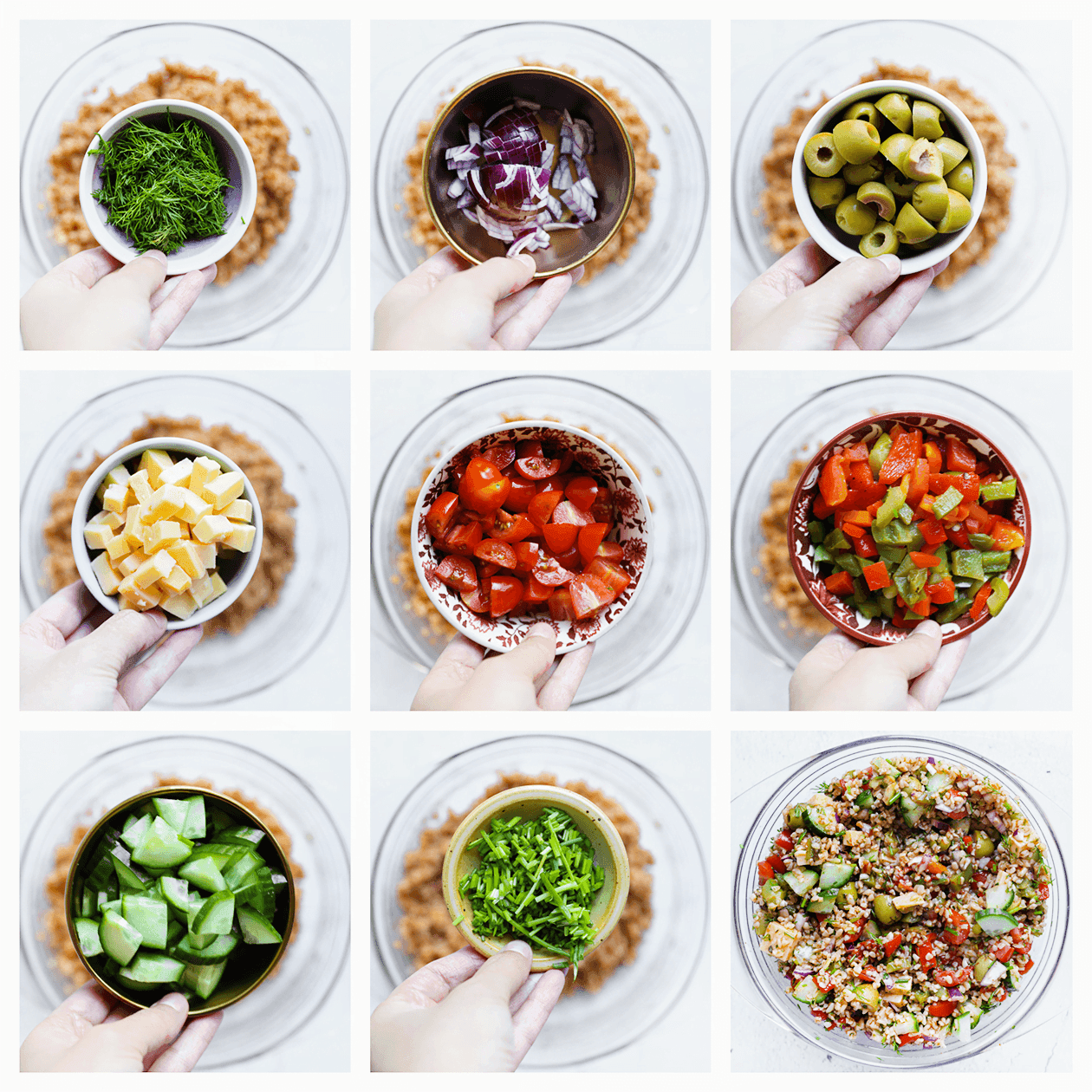 Add the dill, red onion, green olives, diced cheese, cherry tomatoes, grilled bell bell pepper, cucumber and chives to the bulgur. Mix everything together until combined.