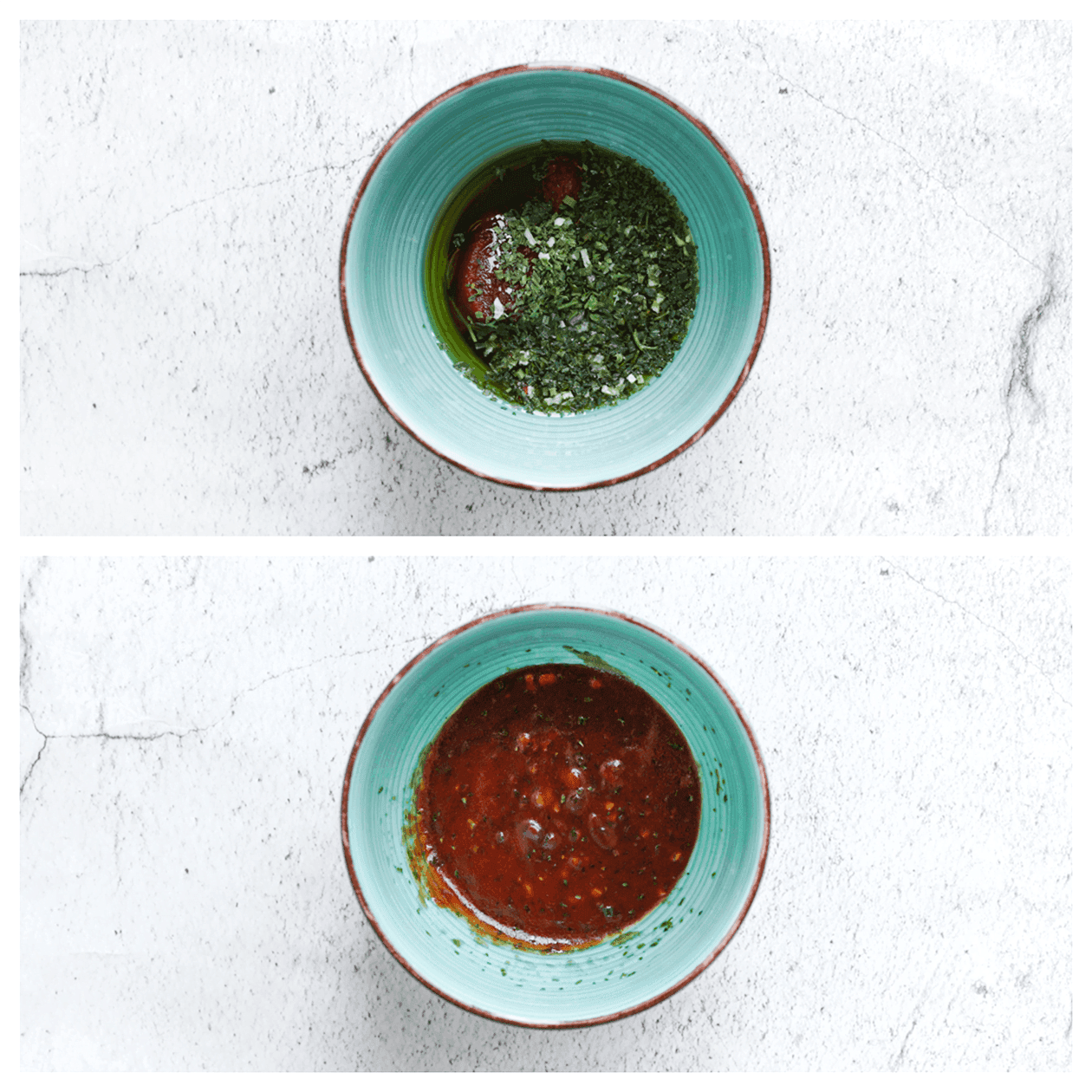 Put the tomato paste, vinegar, olive oil, pomegranate syrup, salad herbs, Italian seasoning and honey in a bowl. Mix these ingredients well.