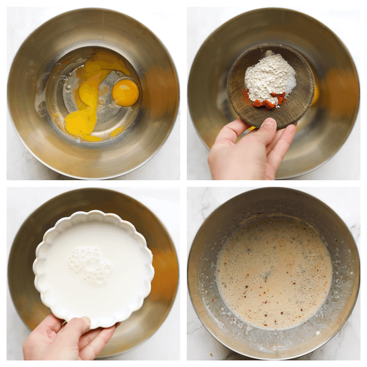 Doe de melk samen met de eieren, paprikapoeder, het zout en uienpoeder in een diepe kom. Meng goed.