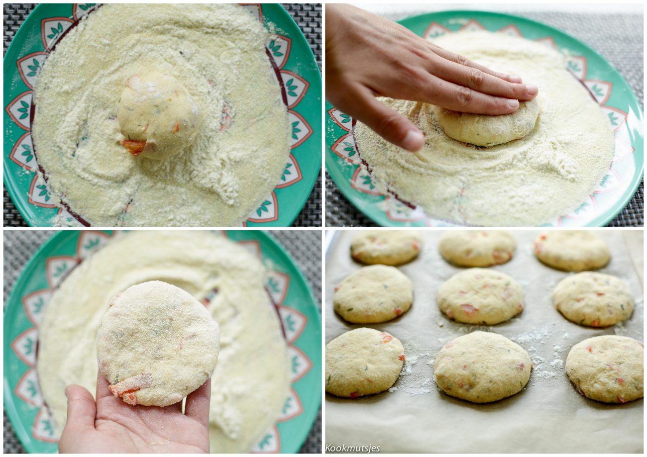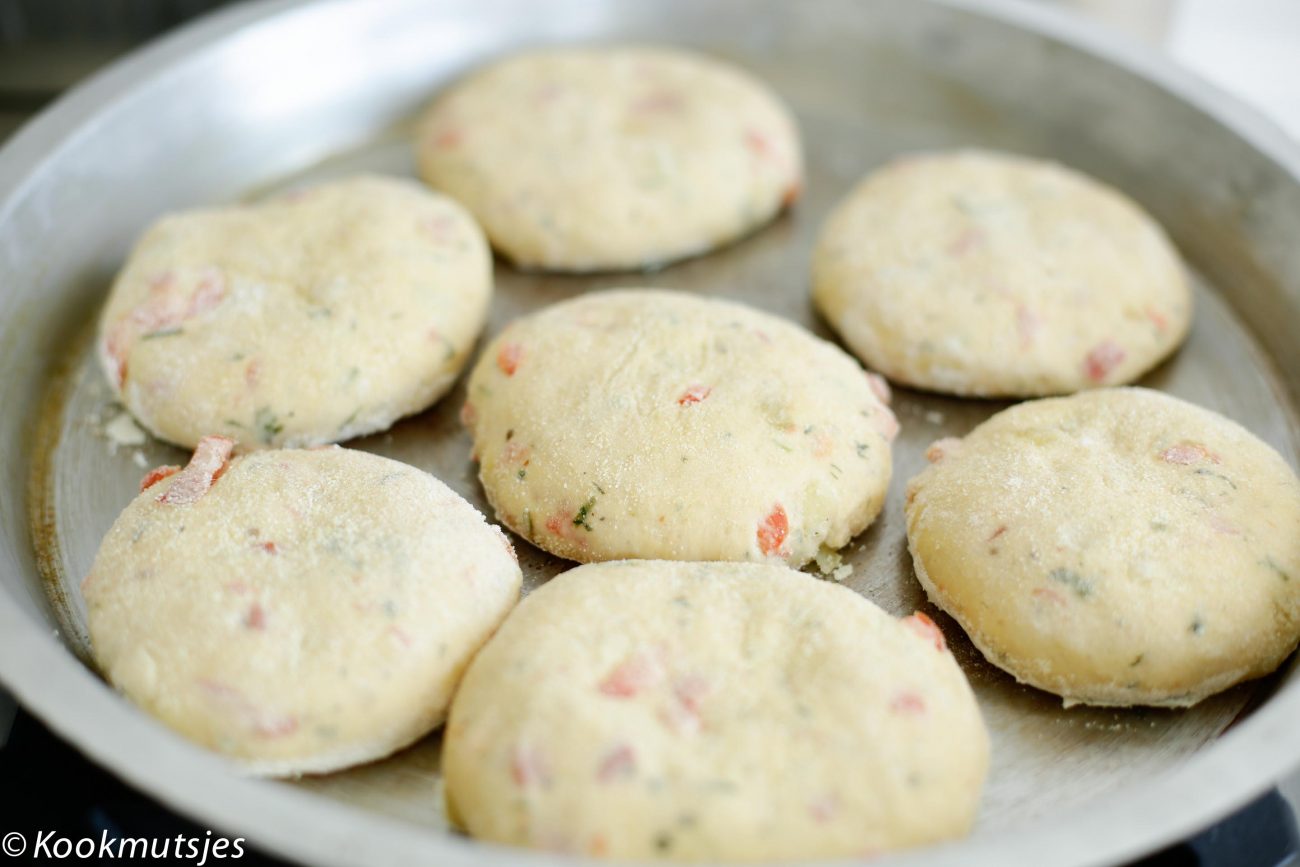 Vorm het deeg in een bol (doe dat met behulp van een beetje bloem). Doe wat griesmeel in een bord en druk het deeg hier lichtjes plat (10 bij 10 cm ongeveer). Leg de broodjes op een vel bakpapier en vergeet er geen extra griesmeel op te strooien. Dit voorkomt dat het deeg blijft plakken. Laat de bollen rijzen voor een half uur of tot het in omvang is verdubbeld op een warme plek. |