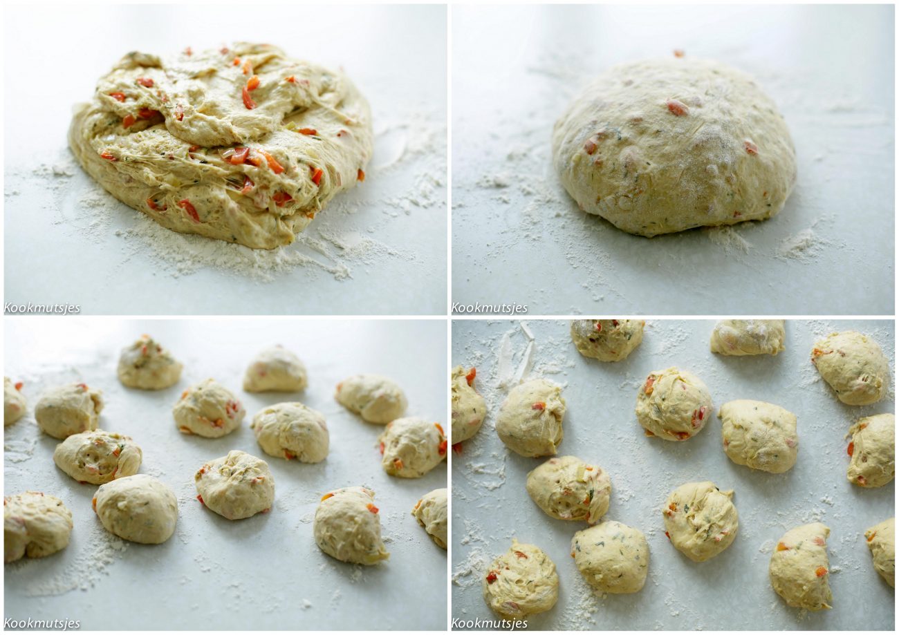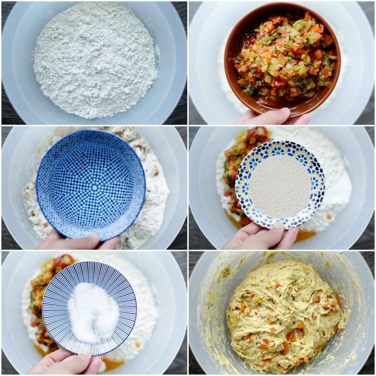 Meng de bloem samen met de gist, zout, charmilla en water goed samen. Kneed het voor zo’n 10 tot 15 minuten. Het deeg is soepel. Voeg op het eind de extra 10 ml zonnebloemolie toe. Kneed het fijn voor een minuut. Dek het deeg af en laat het op een warme plek rijzen voor een uur of tot het in omvang is verdubbeld. |