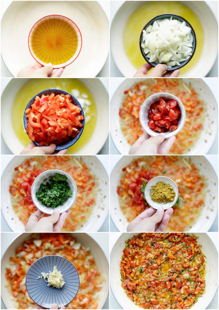 Verhit de olijfolie in een steelpan. Voeg de ui toe en bak het voor zo’n 3 minuten. Voeg de paprika, knoflook, koriander toe en bak weer mee voor 3 minuten minuten. Voeg de snoeptomaatjes en ras el hanout toe en zet het vuur hoog, wanneer het borrelt zet je het vuur op z’n laagst en laat je het 7 minuten verder koken (gebruik wel een deksel). Doe de charmilla in een kom en laat even op kamertemperatuur komen. |