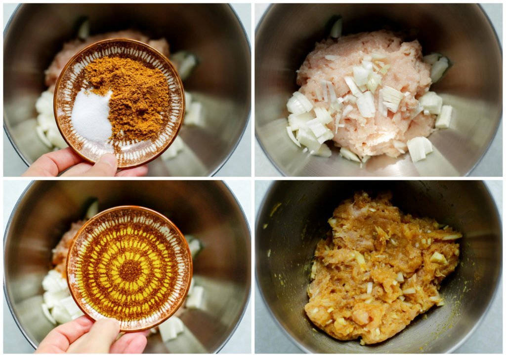 Doe het kipgehakt in een diepe kom. Voeg het zout, ras el hanout, olijfolie en gele ui toe. Meng alle ingrediënten samen. Maak er bollen van (20 gr per bol).