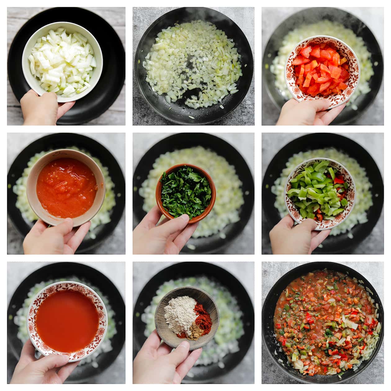 Verhit de olijfolie in een koekenpan op middelhoog vuur. Voeg de gesnipperde gele ui toe en bak 4-5 minuten. Voeg de rode puntpaprika, groene paprika, fijngemalen tomatenpuree, gehakte peterselie, het water, de tomatenpuree, knoflookpoeder, paprikapoeder, komijnpoeder en cayennepeper toe. Meng goed. |
