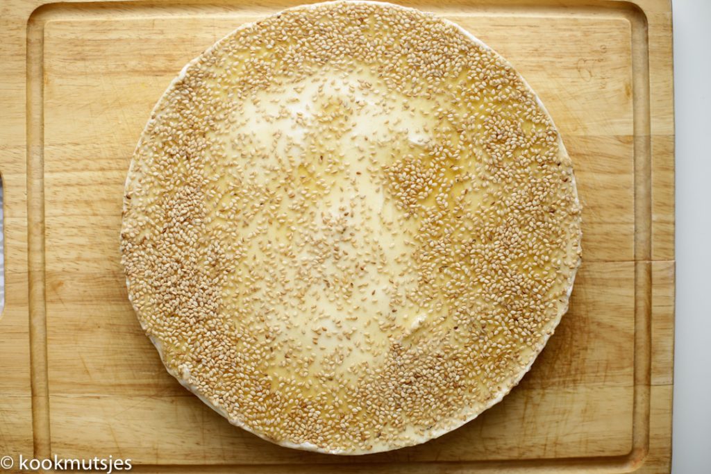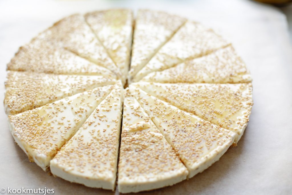 Giet de honing op de cheesecake en maak het af met sesamzaadjes. Leg de cheesecake weer terug in de vriezer voor een een paar uur.