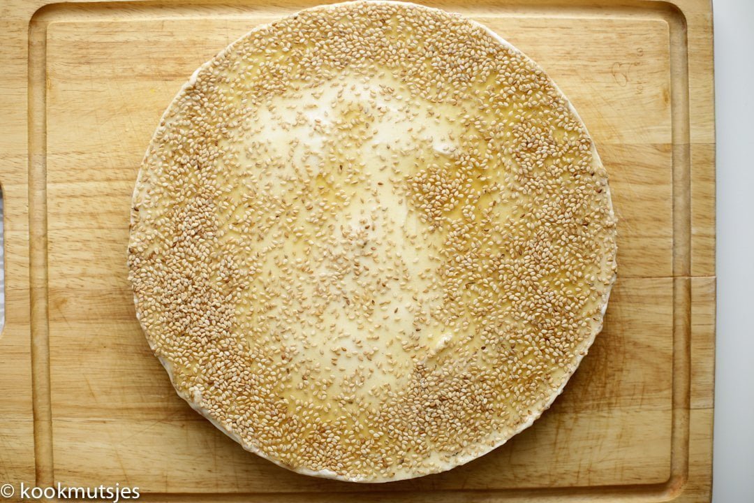 Garneer de chebakia cheesecake met sesamzaadjes.