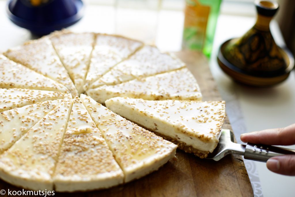 – Zodra de cheesecake uit de vriezer komt, snijd je de chebakia cheesecake direct in mooie rechte stukken. Serveer ze alvast op een bordje. Laat de cheesecake een paar minuten staan voordat je ze gaat eten.