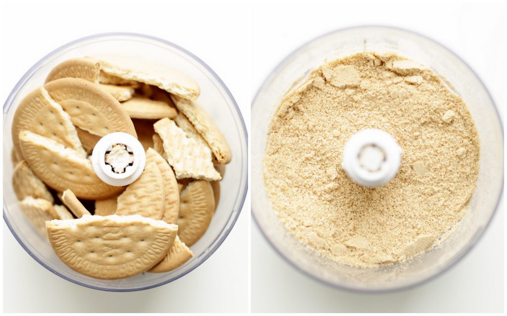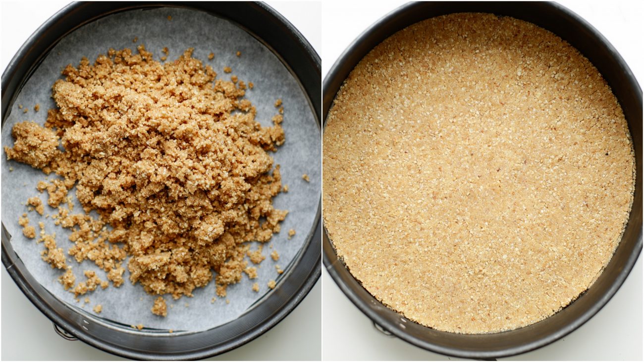 Schep de koekjesdeeg in de bakvorm en druk het goed tegen de bodem aan. Dek het af en leg het in de koelkast (10 tot 15 minuten).