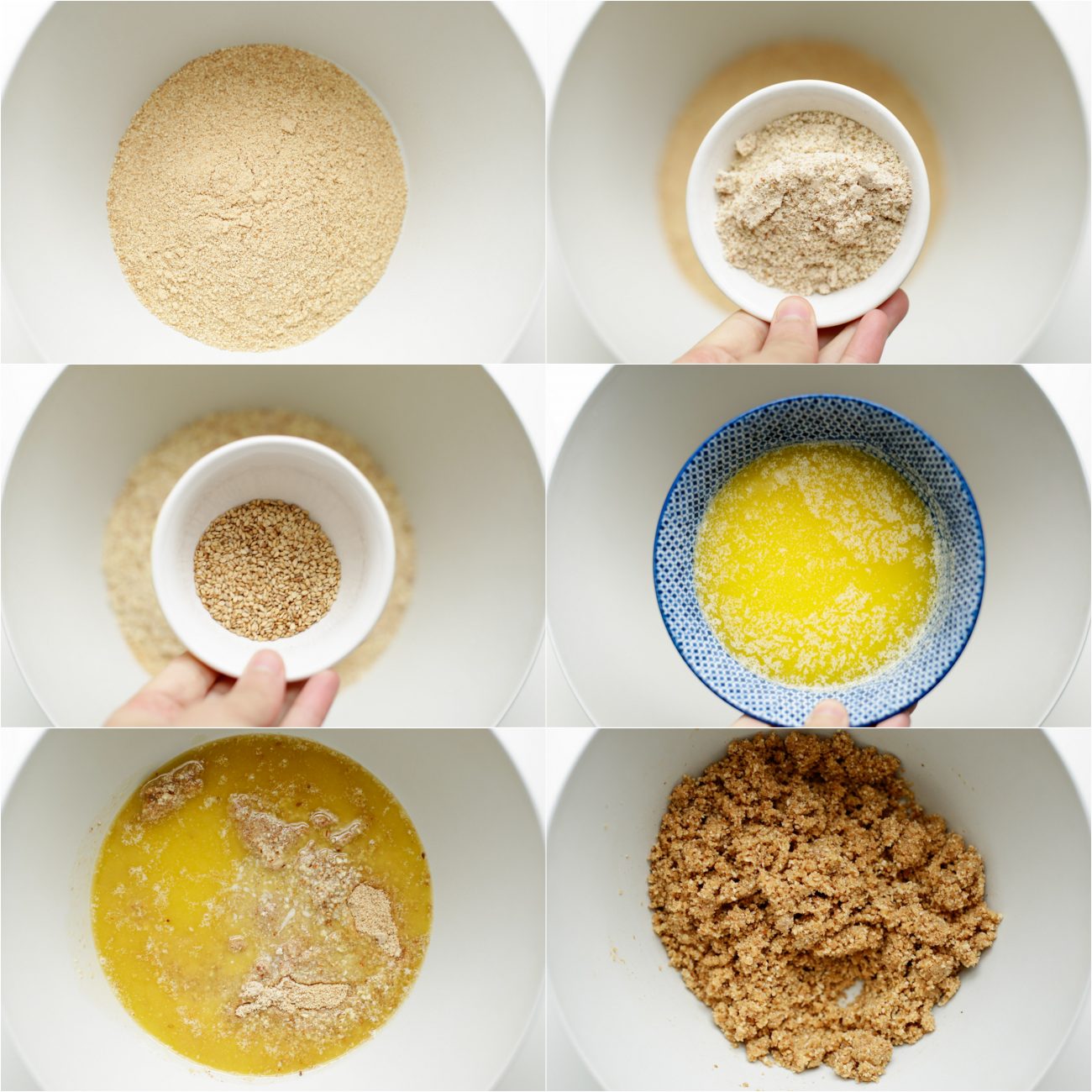 Doe de gemalen koek, amandelen en sesamzaadjes in een diepe kom en voeg de roomboter toe. Meng het samen tot een koekjesdeeg.