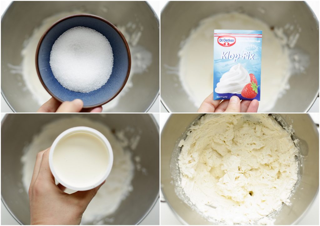 Voeg de vanillesuiker, suiker, ongeklopte slagroom en klopfix toe, mix het samen totdat het goed stevig is.