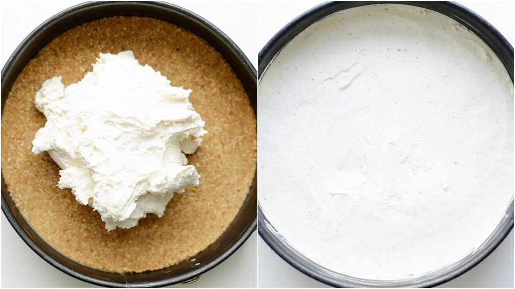 Schep de room erop en smeer alles mooi en gelijkmatig uit. Leg het minimaal 1 uur in de vriezer om stevig te worden.