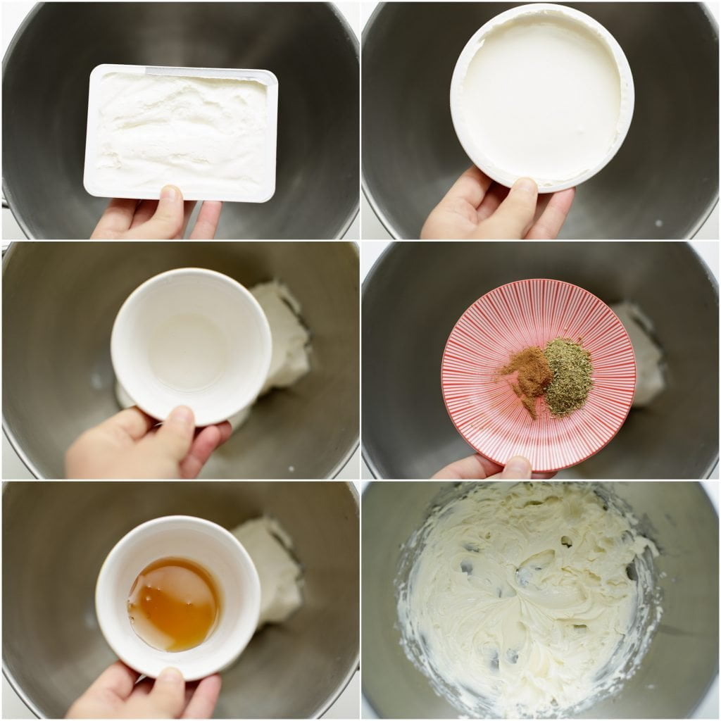 Doe de roomkaas, mascarpone, honing, oranjebloesemwater, azijn, venkelzaadpoeder en kaneelpoeder in een diepe kom en mix het voor een minuut samen tot een geheel.