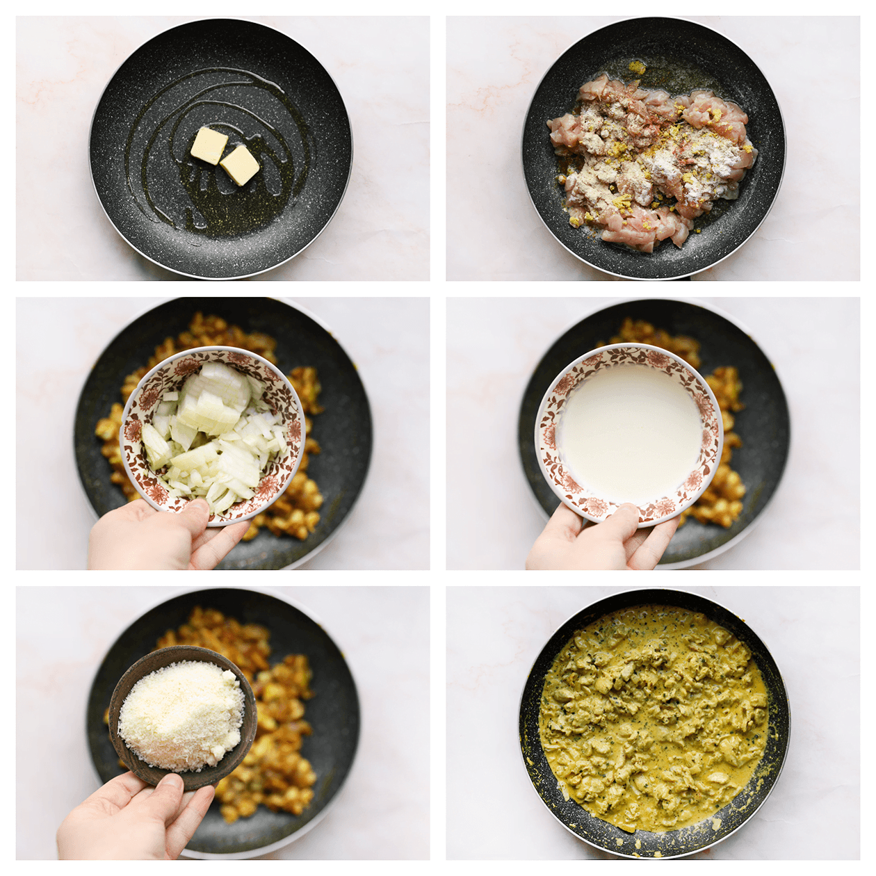 Heat the olive oil along with the butter in a skillet over medium-high heat. Add the chicken breast pieces, curry powder, cayenne pepper, onion powder, garlic powder and Italian seasoning, and crumble the chicken stock cube over the pan. Bake for 2 minutes. Add the yellow onion and cook for 3-4 minutes. Add the unwhipped whipping cream and cook for 4-5 minutes, or until the sauce has thickened. Finally, add the Grana Padano and mix well. |