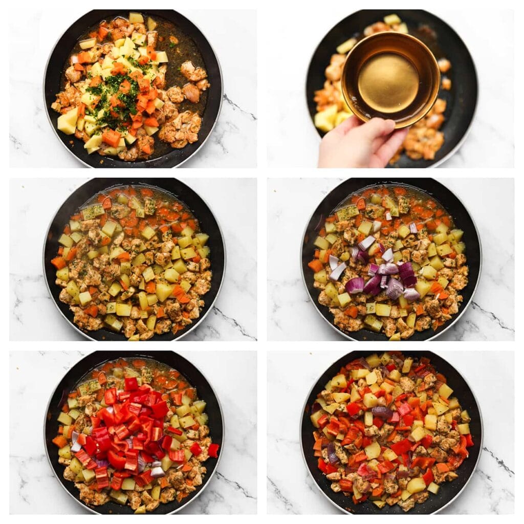 Make sure the potatoes and carrots are almost tender before adding the onion and bell pepper.