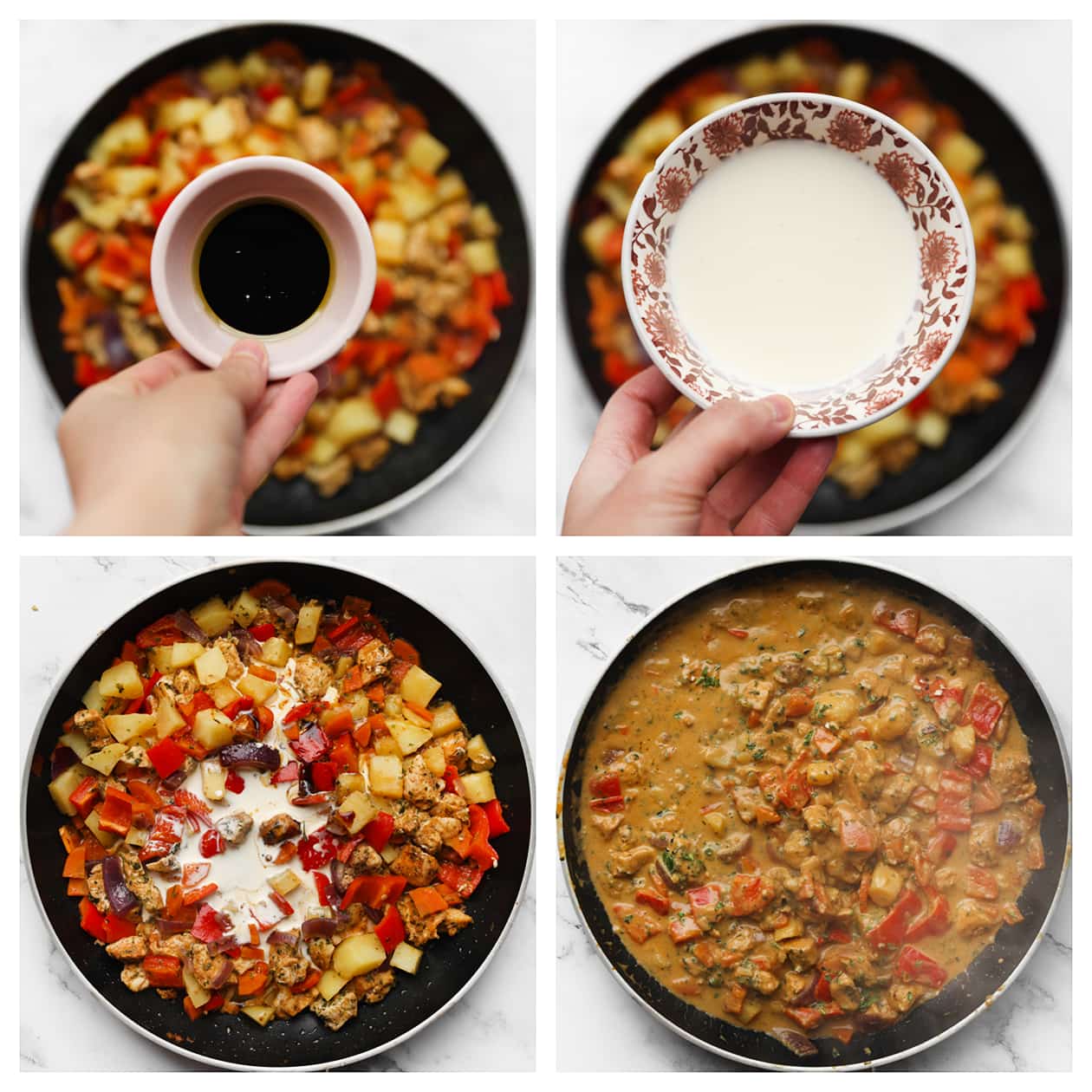 Add the sweet soy sauce, fish sauce, and heavy cream. Stir well and cook uncovered until the sauce thickens.