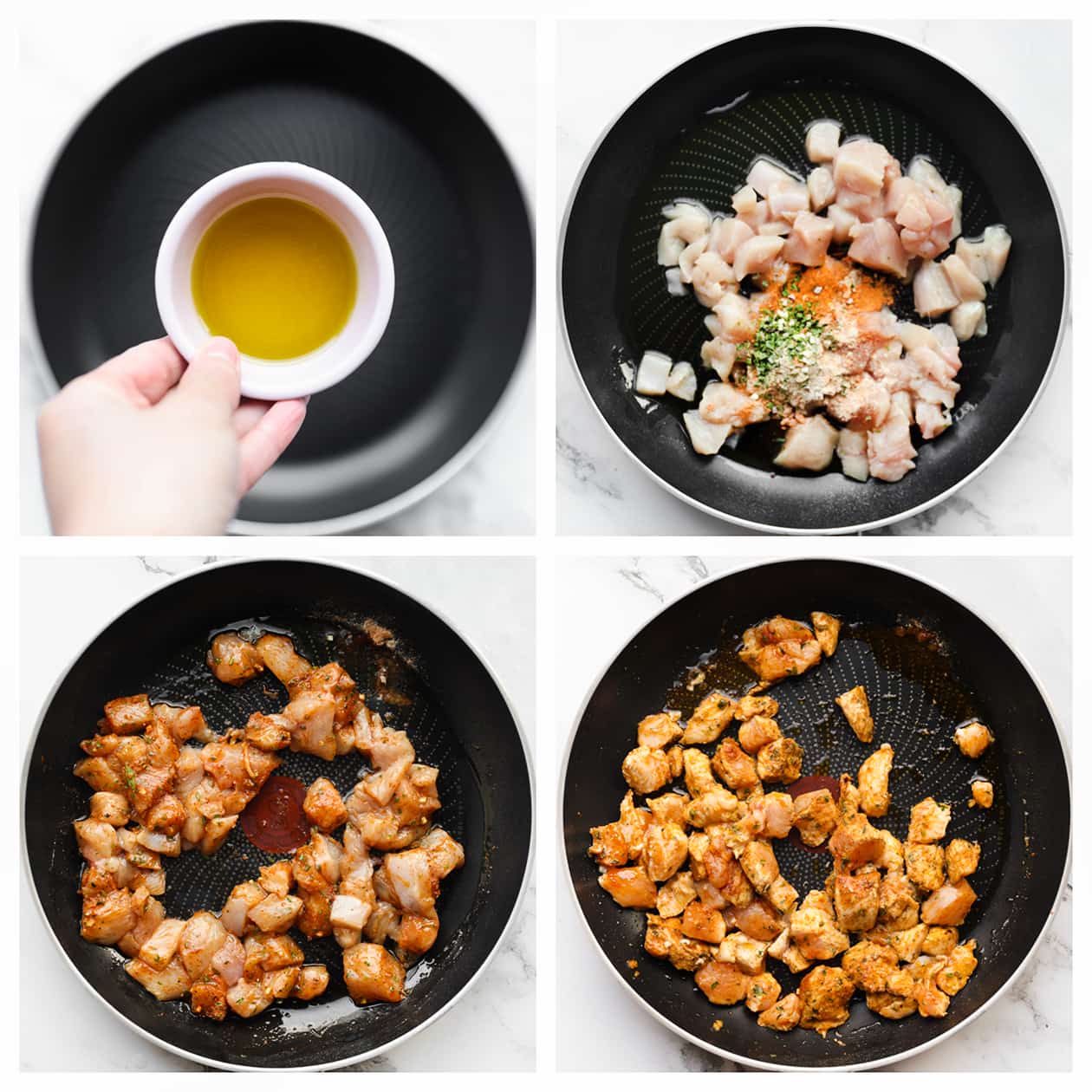 Heat the olive oil in a frying pan over medium heat. Add the chicken, ras el kouzina, garlic powder, cayenne powder, black pepper, and salad seasoning. Sauté for 3–4 minutes.