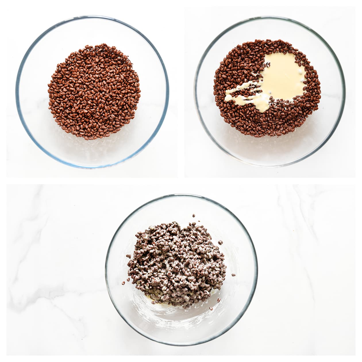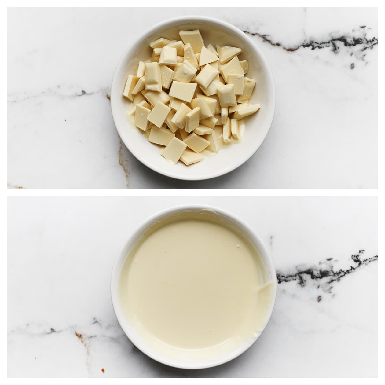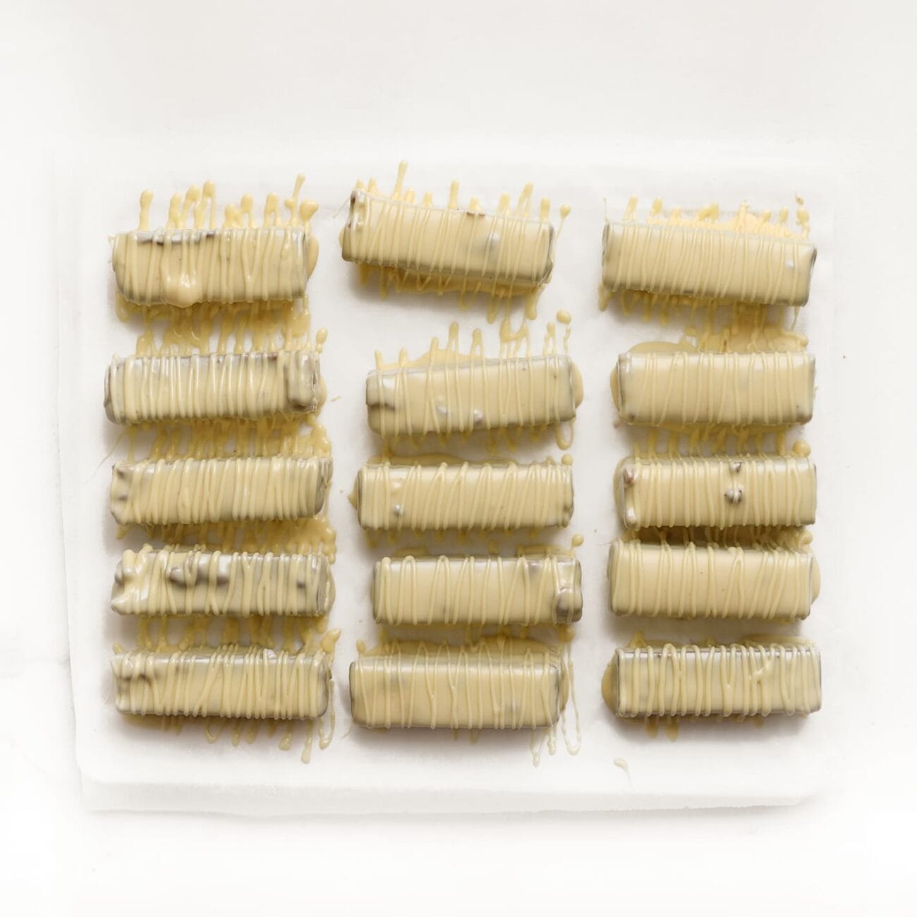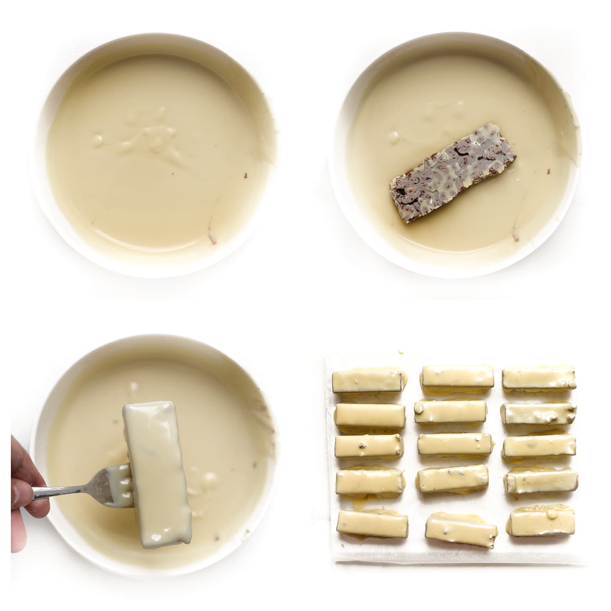 Use a fork to dip the pieces into the white chocolate and gently tap against the side of the bowl to let excess chocolate drip off.